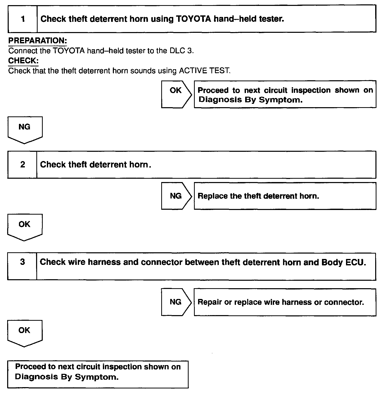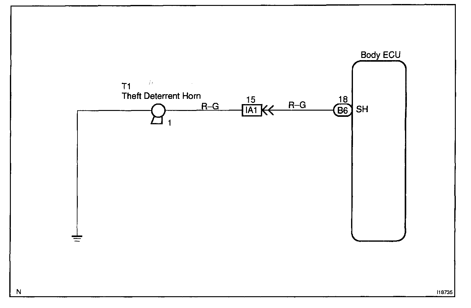 CIRCUIT DESCRIPTIONDuring warning of the theft deterrent system, the Body ECU activates the theft deterrent horn.