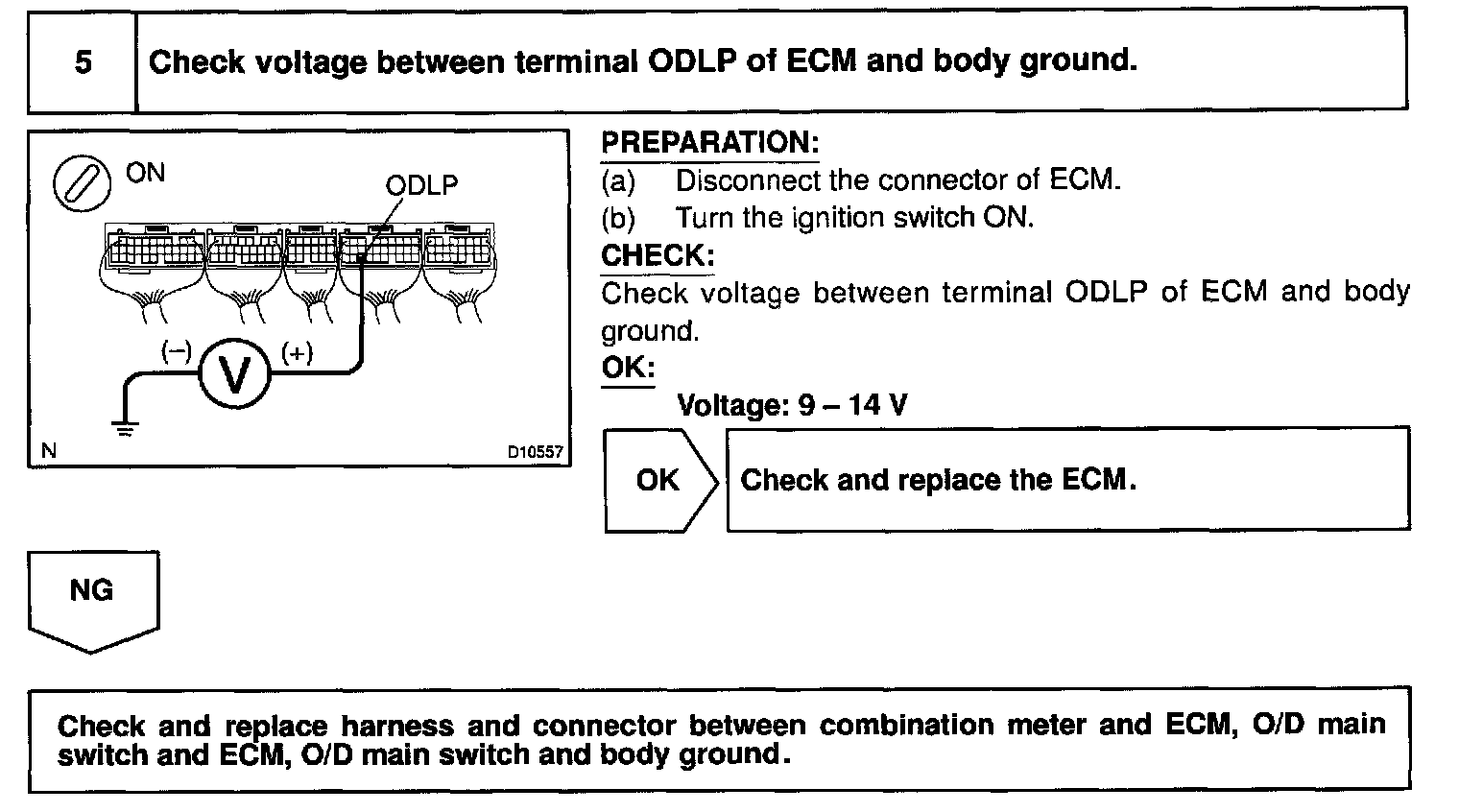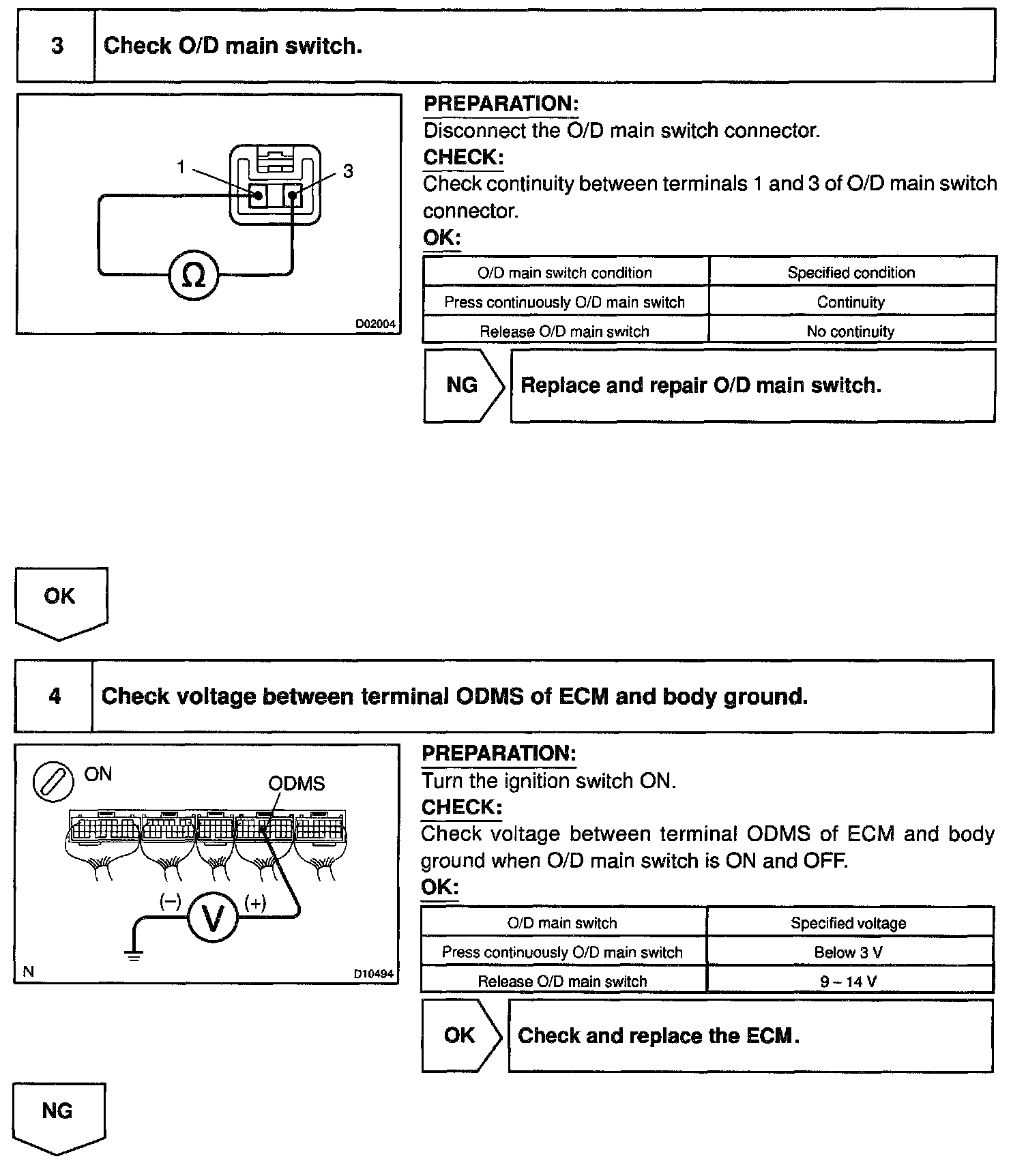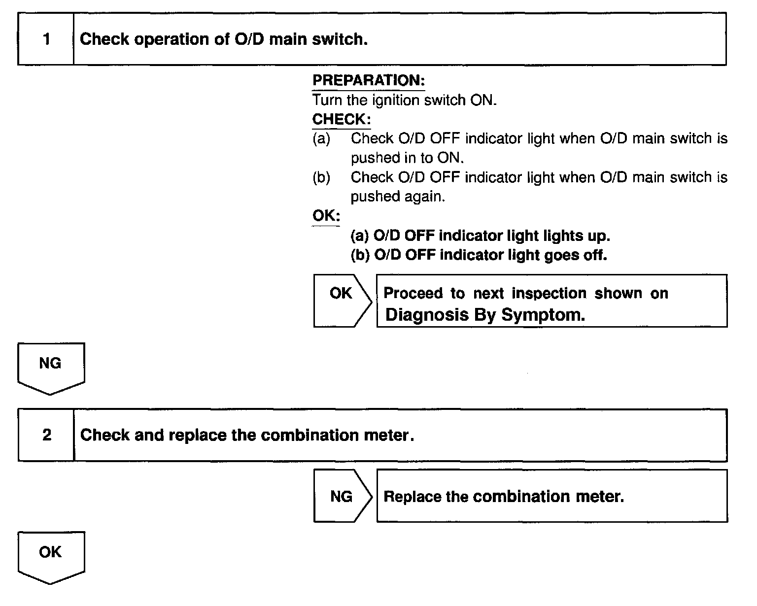 The O/D main switch is a momentary type switch. When pressing the O/D OFF main switch, the O/D OFF indicator light lights up and ECM prohibits shifting to O/D, and when pressing it again, the O/D OFF indicator light goes off and ECM allows shifting to O/D. Turning the IG switch OFF will reset the O/D OFF indicator light.