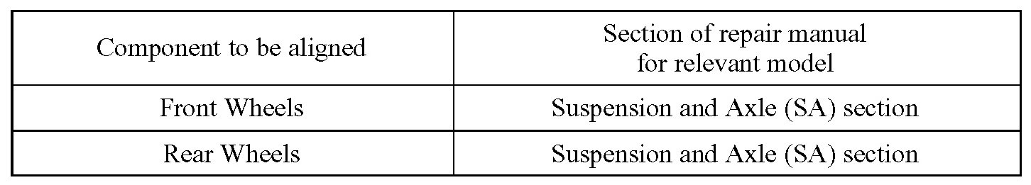 The drive train and chassis are components that can have great effects on the running performance and vibration resistance of the vehicle. After installing components in the sections listed in the table, perform alignments to ensure correct mounting angles and dimensions. Particularly accurate repair of the body must also be done to ensure correct alignment.