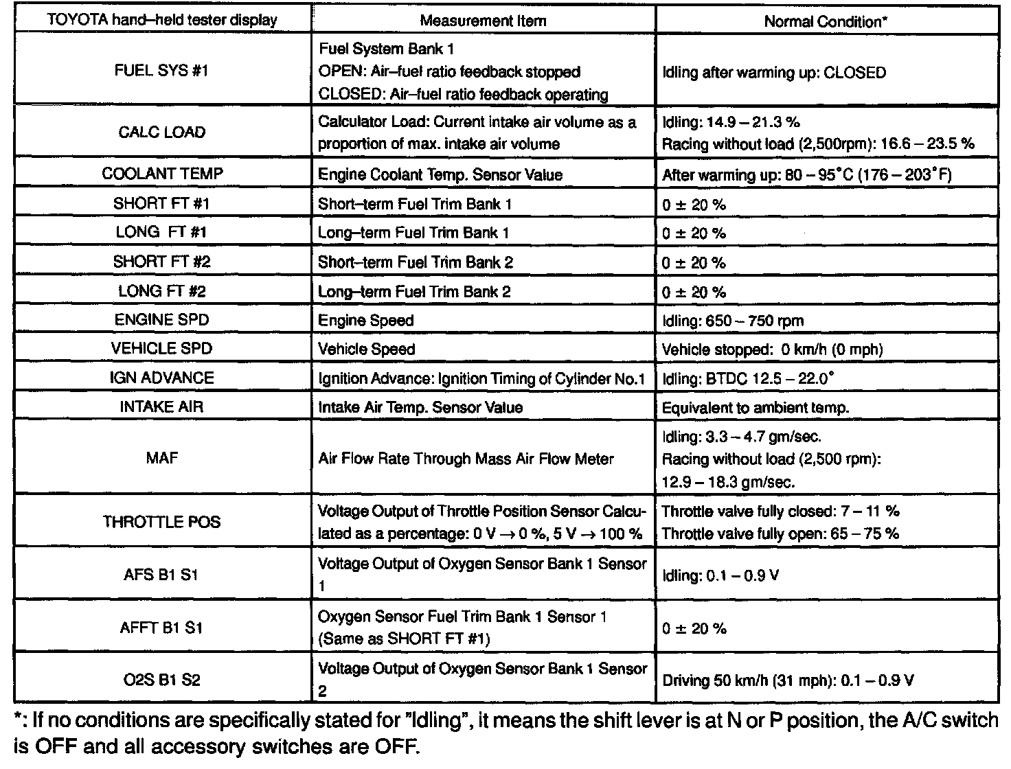 NOTE: The values given below for "Normal Condition" are representative values, so a vehicle may still be normal even if its value varies differ from those listed here. So do not decide whether a part Is faulty or not solely according to the "Normal Condition" here.
