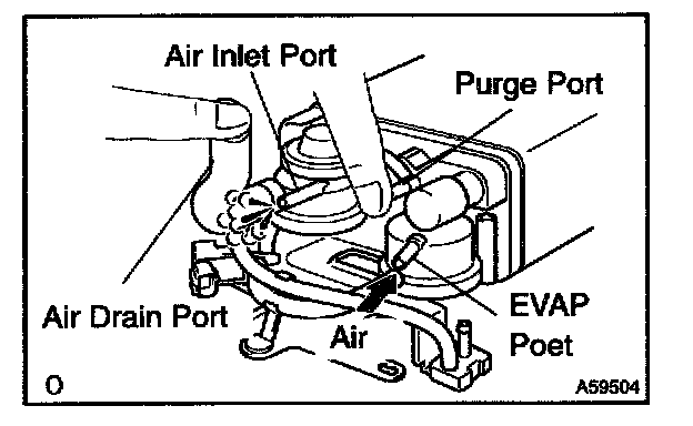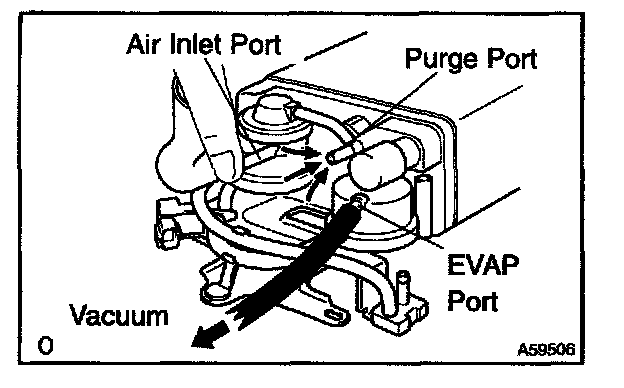 5. While holding the air inlet port closed, apply vacuum (3.43 kPa, 25.7 mmHg, 1.01 in.Hg) to the EVAP port and check that air flows into the purge port.