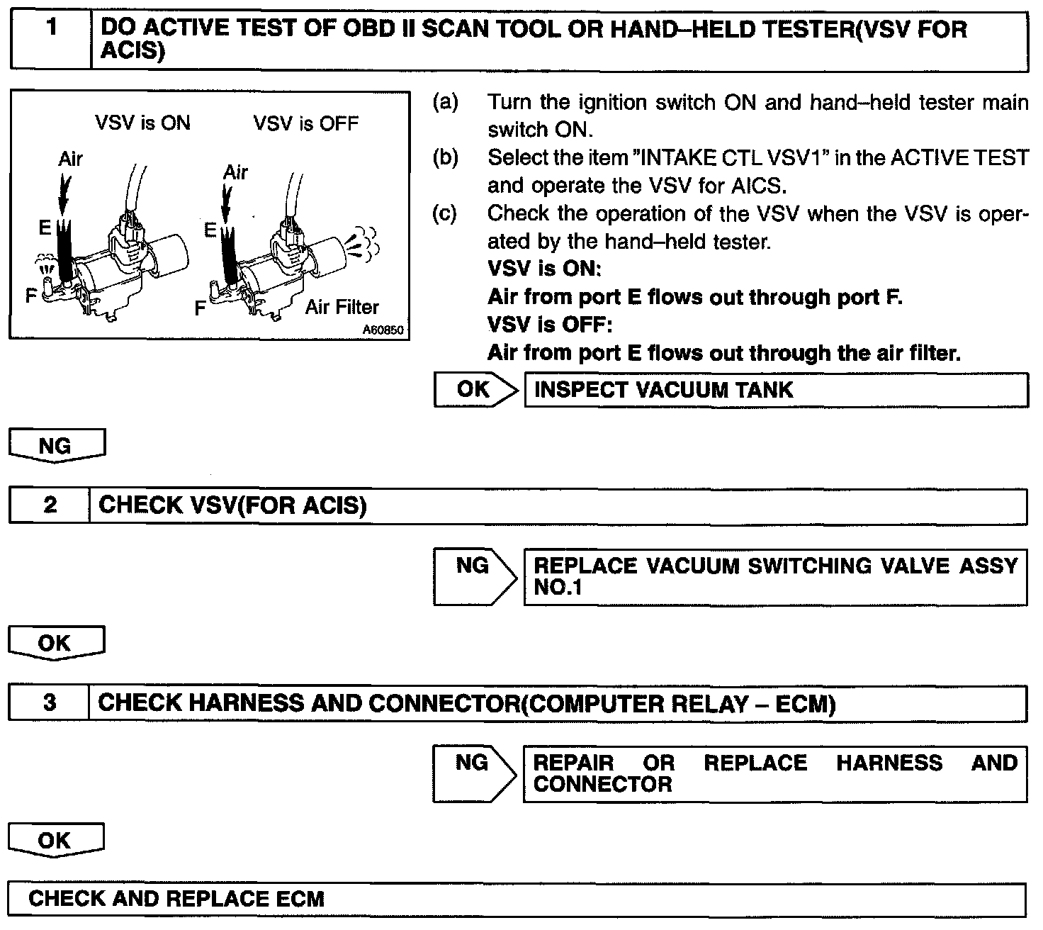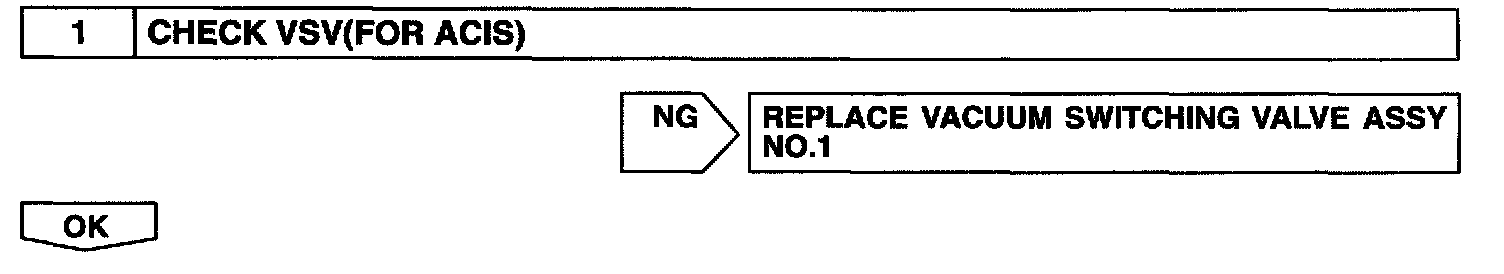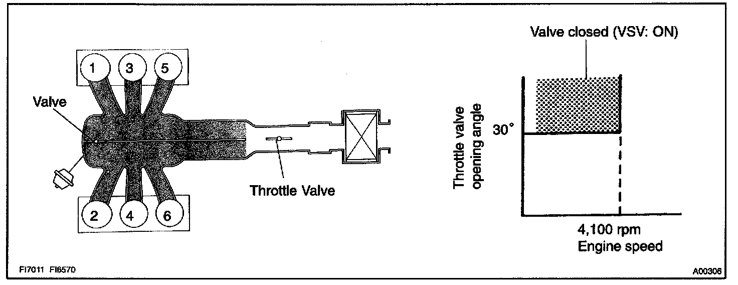 When the engine speed is 4,100 rpm or less and the throttle valve opening angle is 30° or more, the ECM turns the two VSV ON or OFF and operate the Intake Air Control Valve.