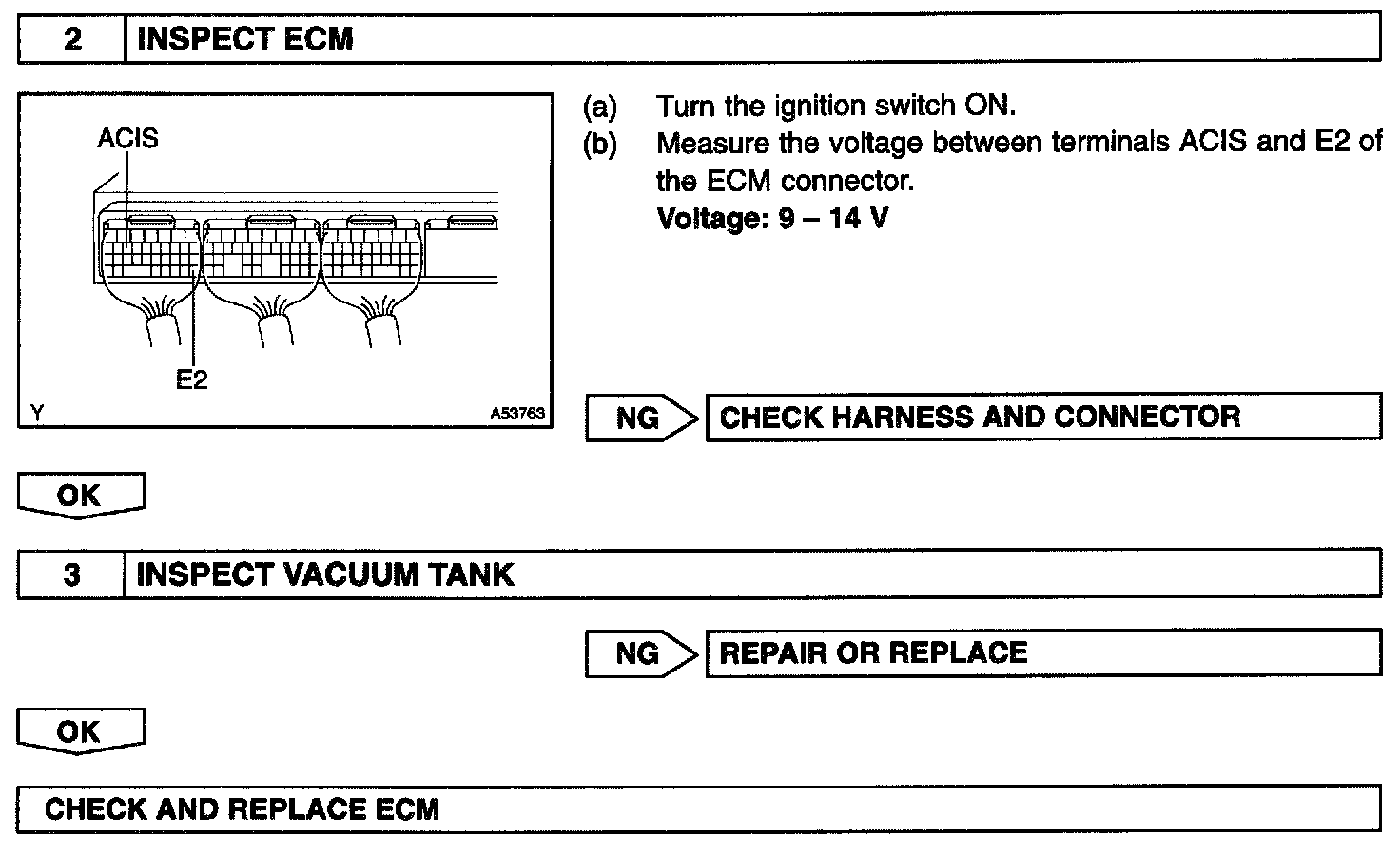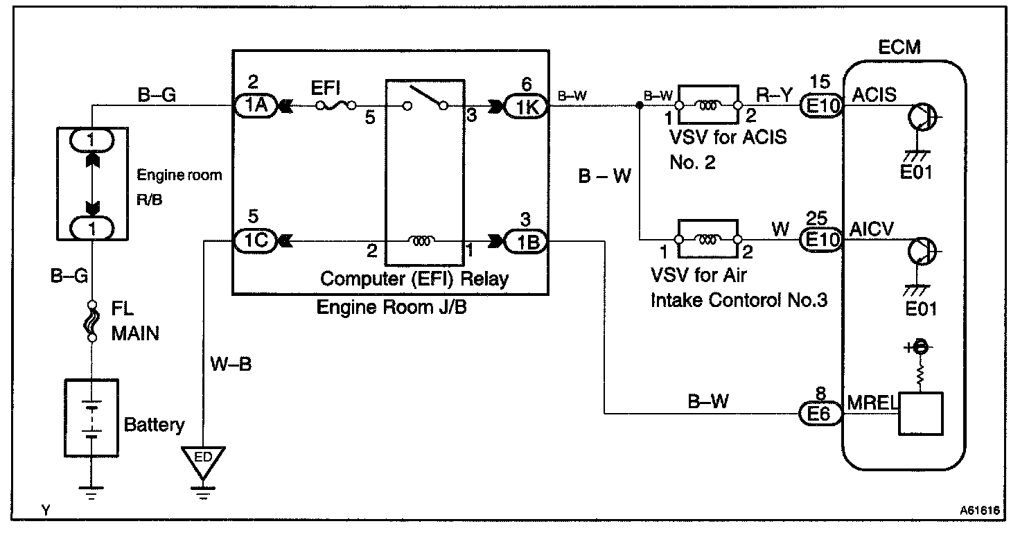 CIRCUIT DESCRIPTIONThis circuit is opens and closes the Intake Air Control Valve in response to the engine load in order to increase the intake efficiency (ACIS: Acoustic Control Induction System).
