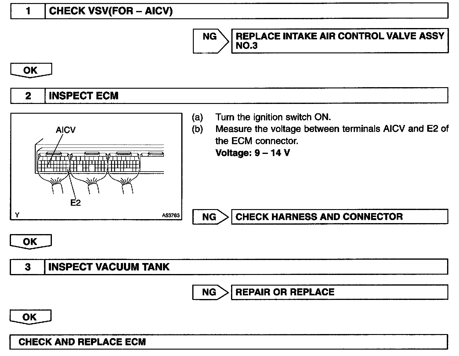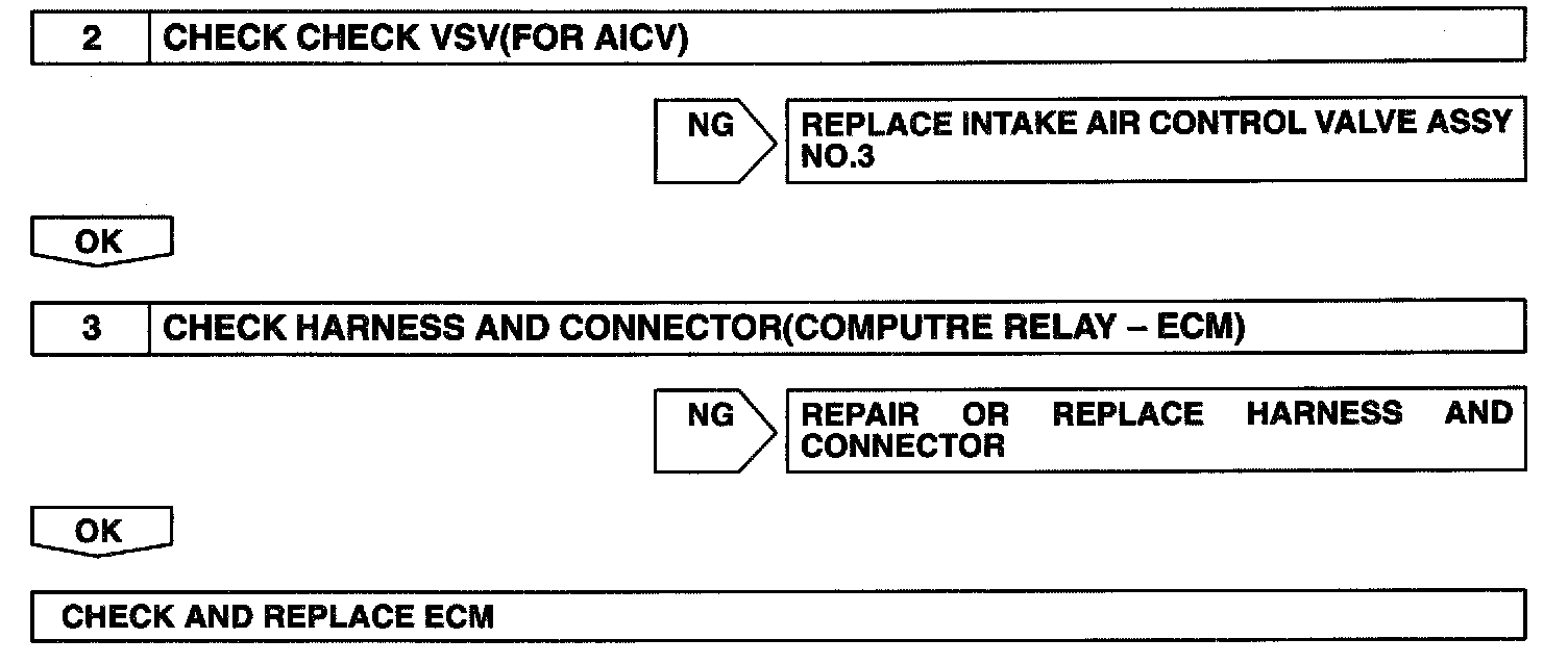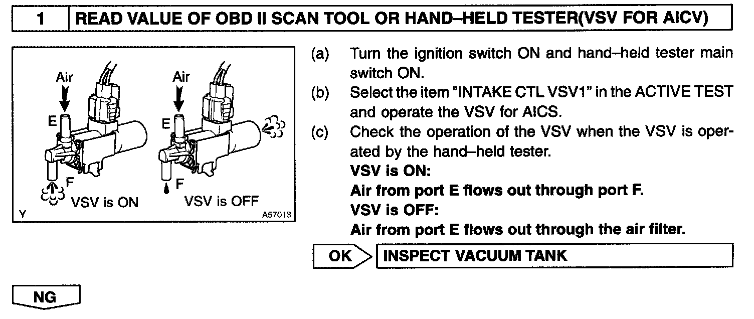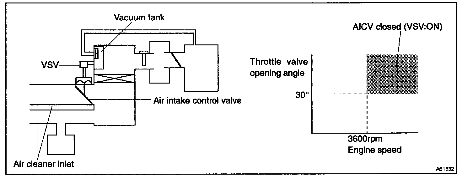 When the engine speed is more than 3600 r/min. and the opening of the throttle valve is more than 300, the ECM activates VSV ON and operates AICV.