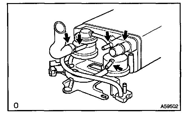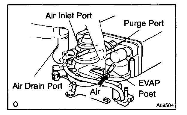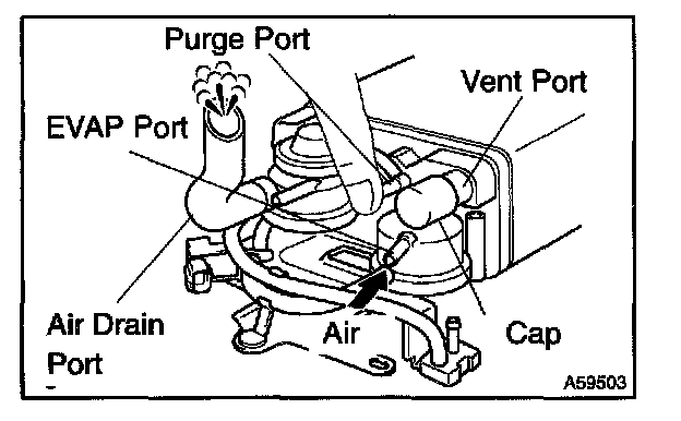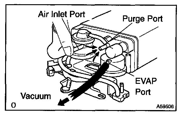 5. While holding the air inlet port closed, apply vacuum (3.43 kPa, 25.7 mmHg, 1.01 in.Hg) to the EVAP port and check that air flows into the purge port.