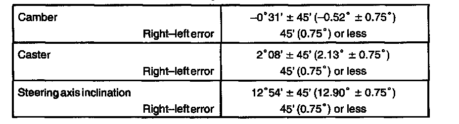 If the caster and steering axis inclination are not within the specified values, after the camber has been correctly adjusted, recheck the suspension parts for damaged and/or worn out parts.