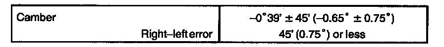 If the measured value is not within the specified value, inspect the suspension parts for damage and/or wear and replace them if necessary because camber is not adjustable.