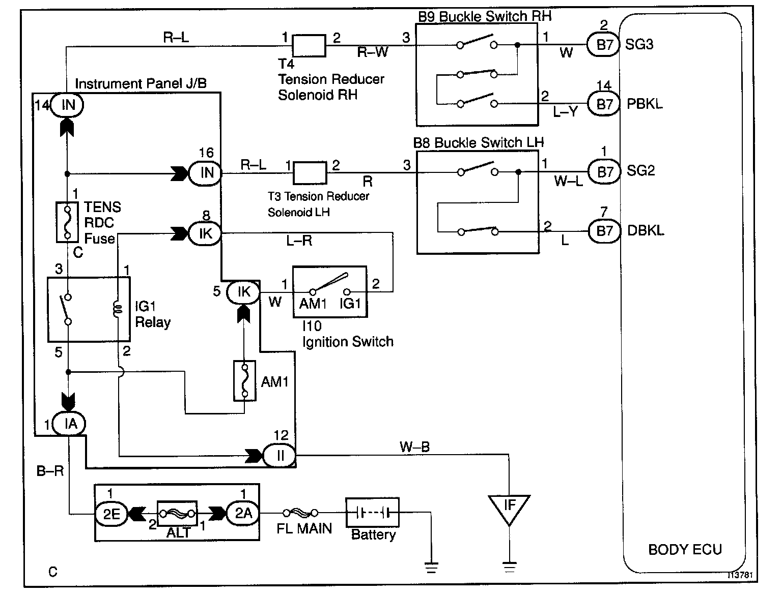 CIRCUIT DESCRIPTIONWhen the buckle switch of the driver's seat is ON with the ignition switch ON, the body ECU sends a signal to make the seat belt warning light for the driver's seat light up and to sound a buzzer.