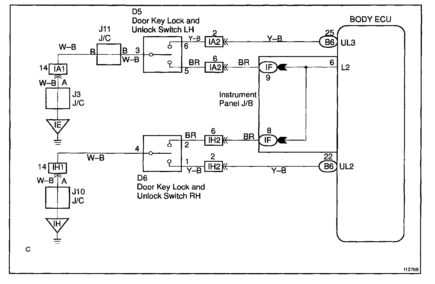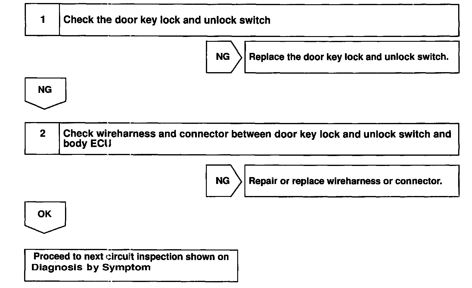 The door key lock and unlock switch is built in the door key cylinder. When the key is turned to the lock side, terminal 3 of the switch is grounded and when the key is turned to the unlock side, terminal 2 of the switch is grounded.