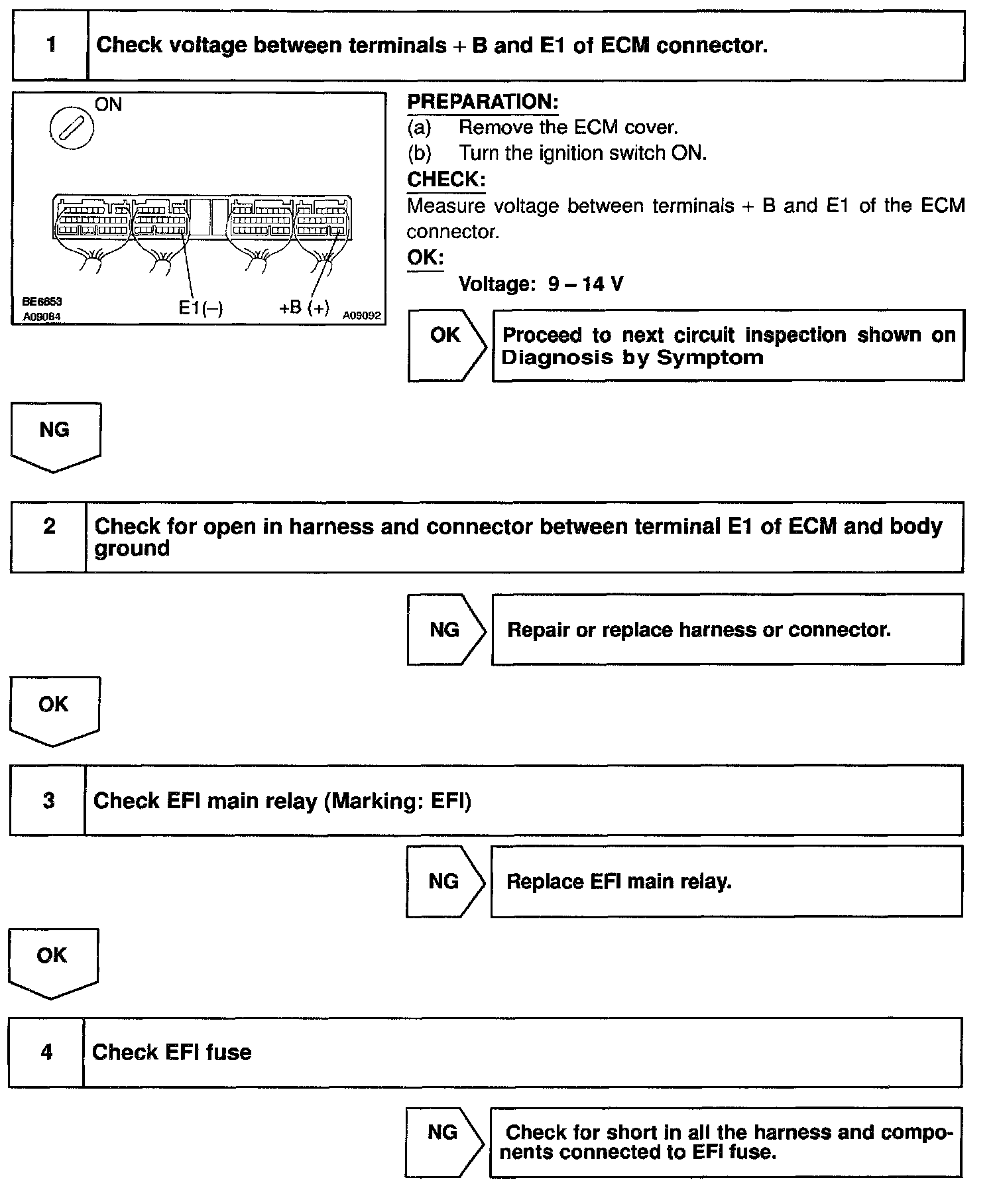 CIRCUIT DESCRIPTIONWhen the ignition switch is turned ON, battery positive voltage is applied to the coil, closing the contacts of the EFI main relay (Making: EFI) and supplying power to the terminal +B of the ECM