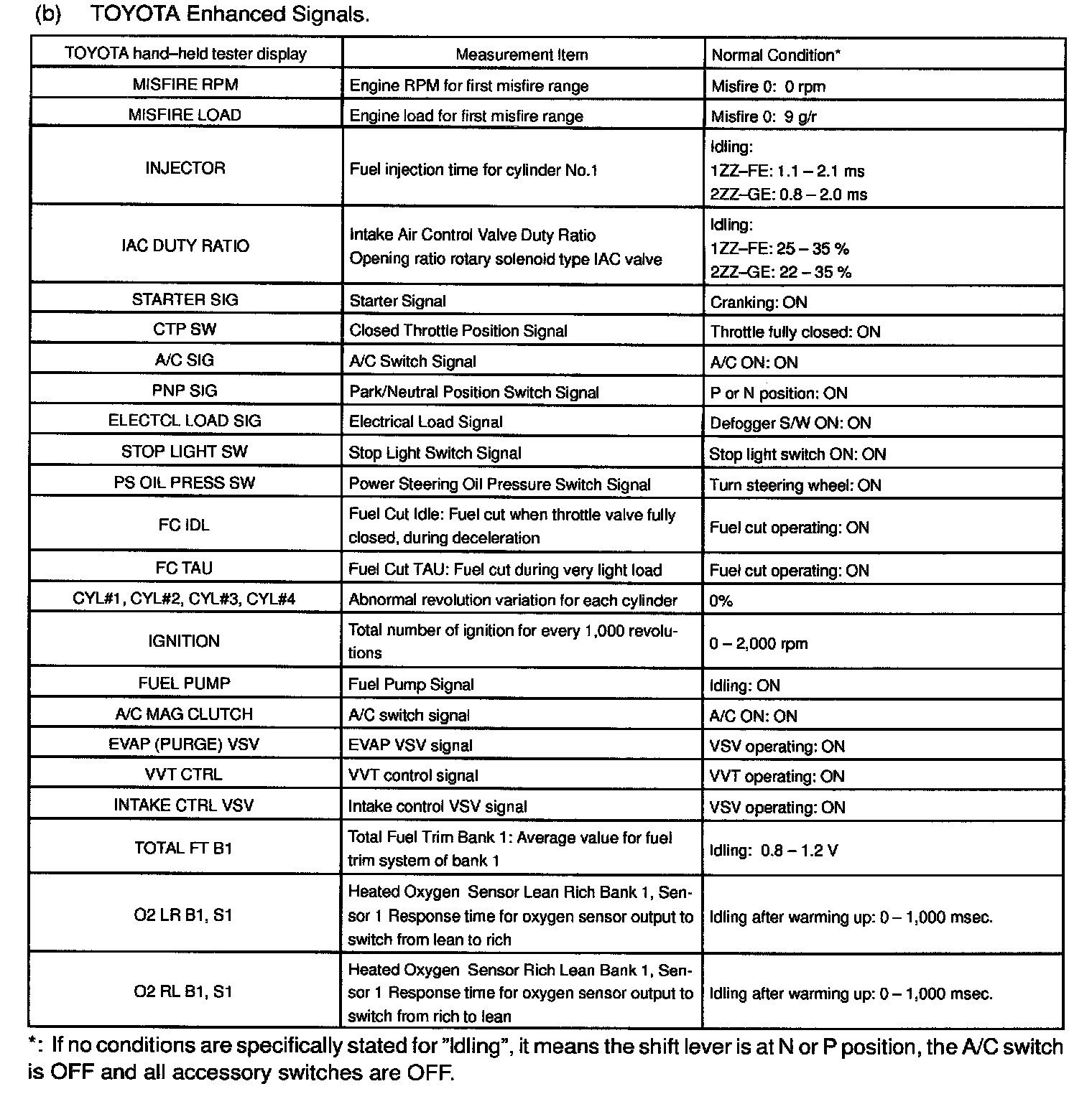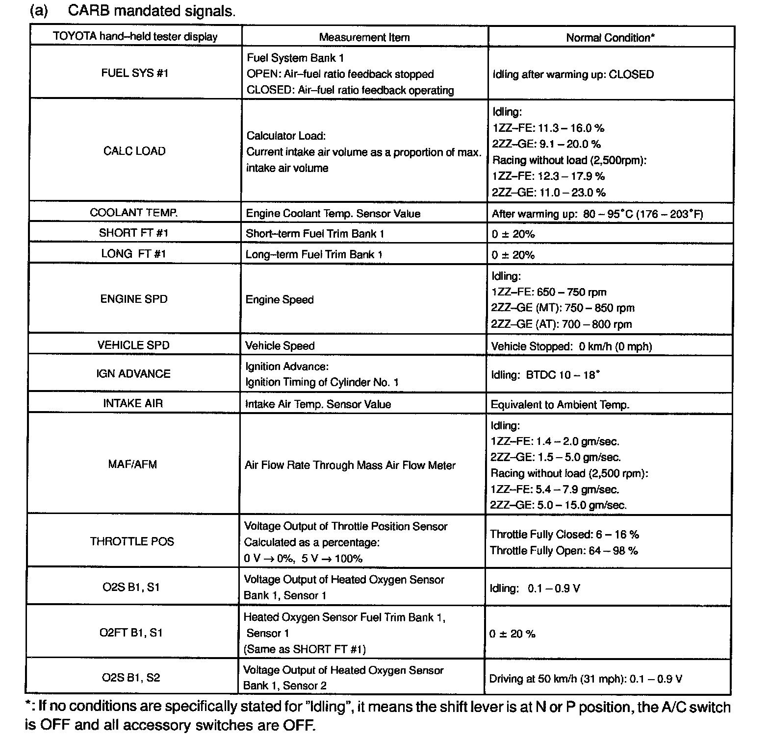 NOTE: The values given below for "Normal Condition" are representative values, so a vehicle may still be normal even if its value varies from those listed here. So do not decide whether a part is faulty or not solely according to the "Normal Condition" here.