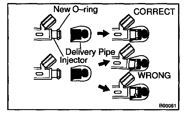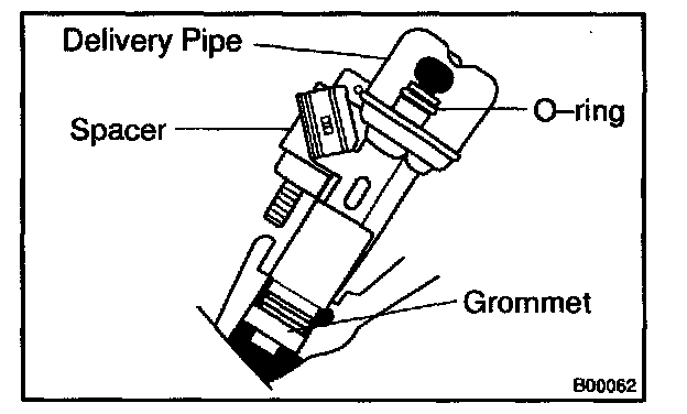 c. Install the injector to the delivery pipe and cylinder head, as shown in the illustration. Before in installing the injector, must apply spindle oil or gasoline on the place where a delivery pipe or a cylinder head touches on O-ring of the injector.