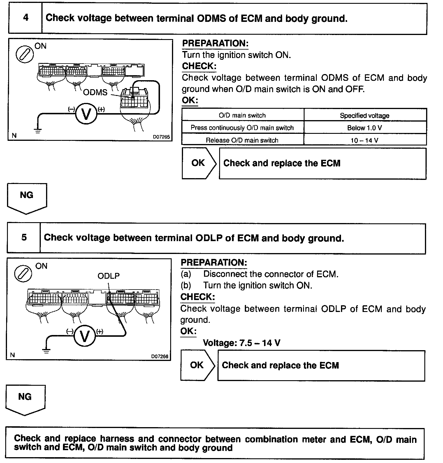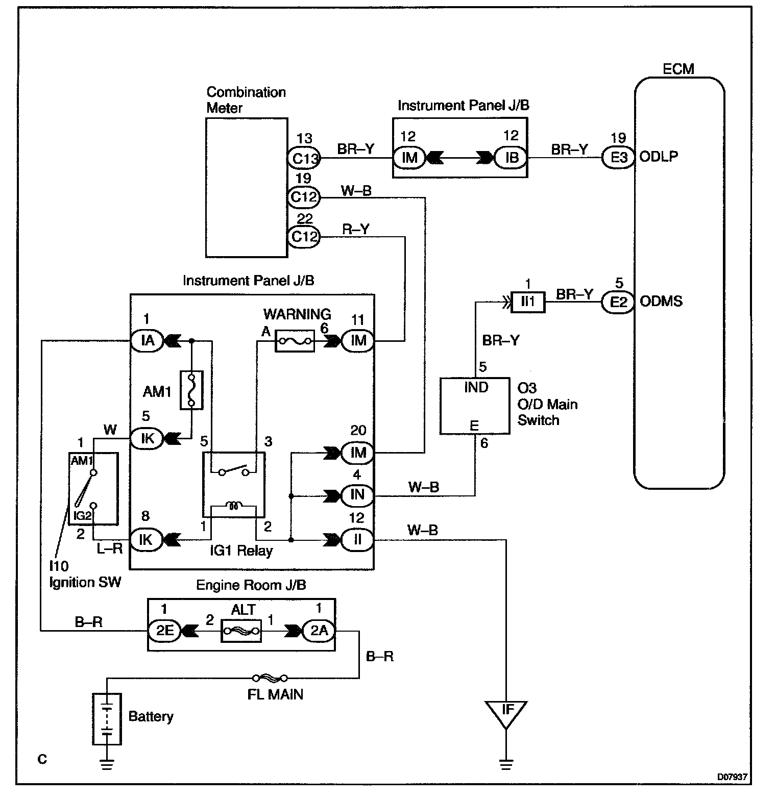 CIRCUIT DESCRIPTIONThe O/D main switch is a momentary type switch. When pressing the O/D main switch, the O/D OFF indicator light lights up and ECM prohibits shifting to O/D, and when pressing it again, the O/D OFF indicator light goes off and ECM allows shifting to O/D. Turning the IG switch OFF will reset the O/D OFF indicator light.
