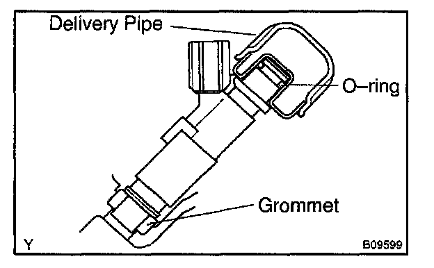c. Install the injector to the delivery pipe and cylinder head, as shown in the illustration. Before installing the injector, must apply spindle oil or gasoline on the place where a delivery pipe or a cylinder head touches on O-ring or grommet of the injector.