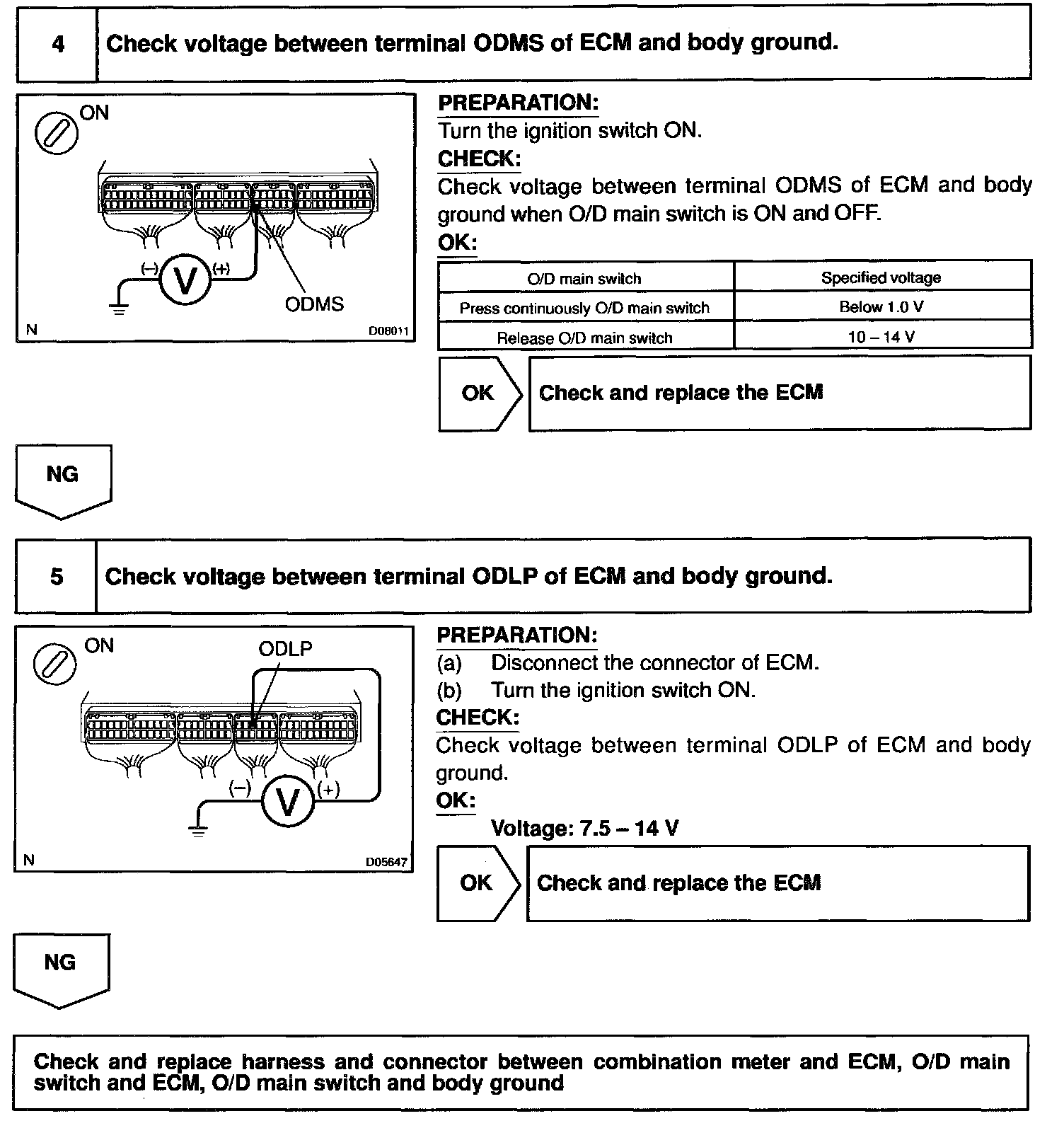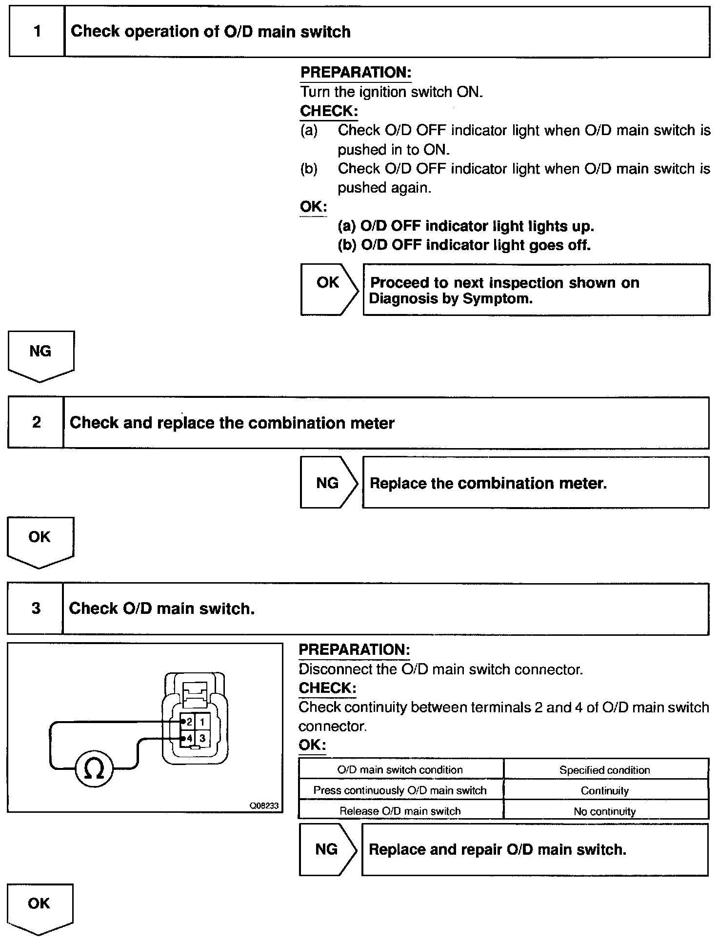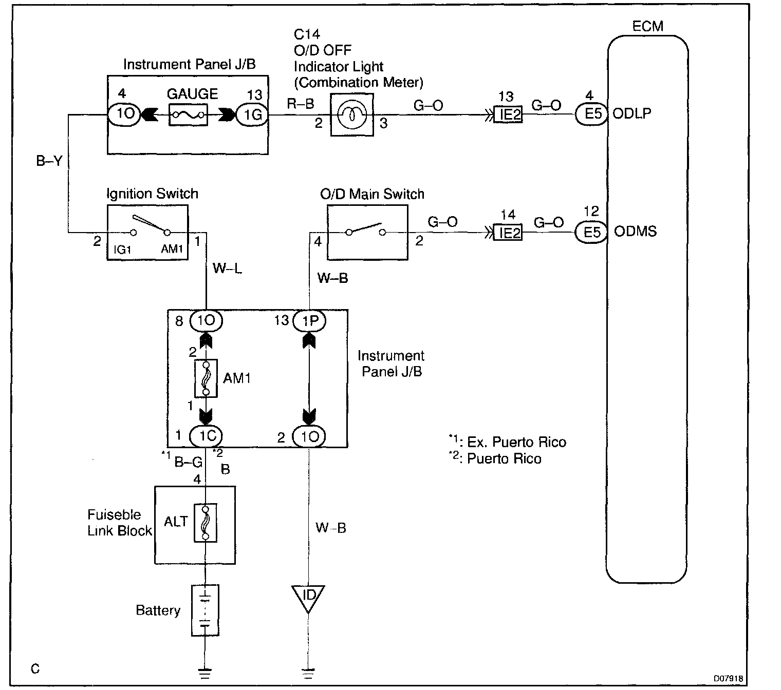 CIRCUIT DESCRIPTIONThe O/D main switch is a momentary type switch. When pressing the O/D main switch, the O/D OFF indicator light lights up and ECM prohibits shifting to O/D, and when pressing it again, the O/D OFF indicator light goes off and ECM allows shifting to O/D. Turning the IG switch OFF will reset the O/D OFF indicator light.