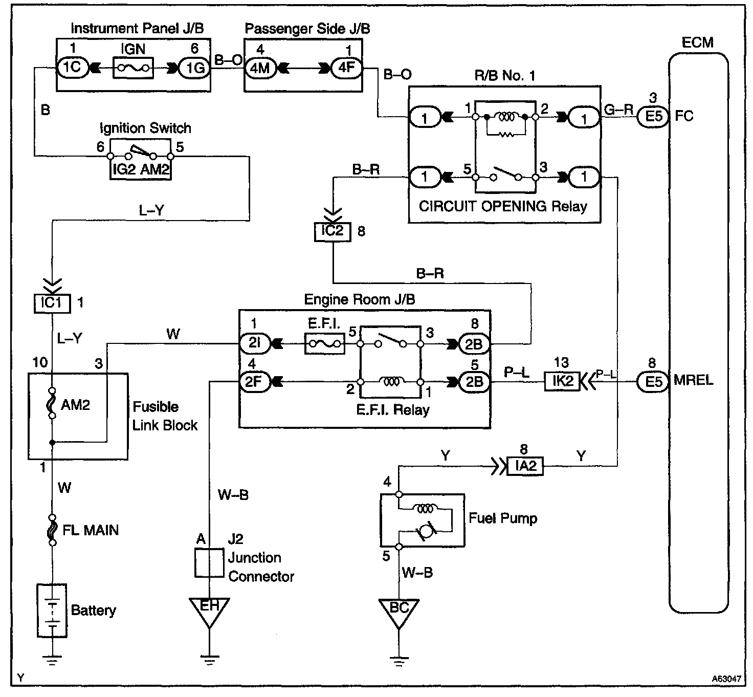 CIRCUIT DESCRIPTIONIn the diagram, when the engine is cranked, current flows from terminal ST of the ignition switch to the starter relay coil and also current flows to terminal STA of ECM (STA signal).