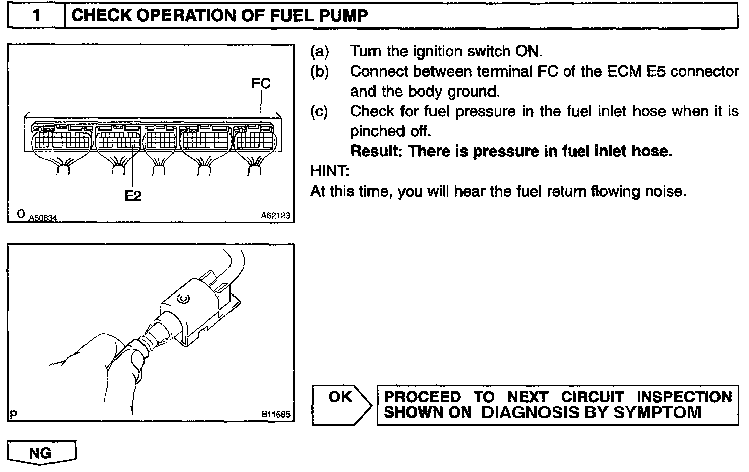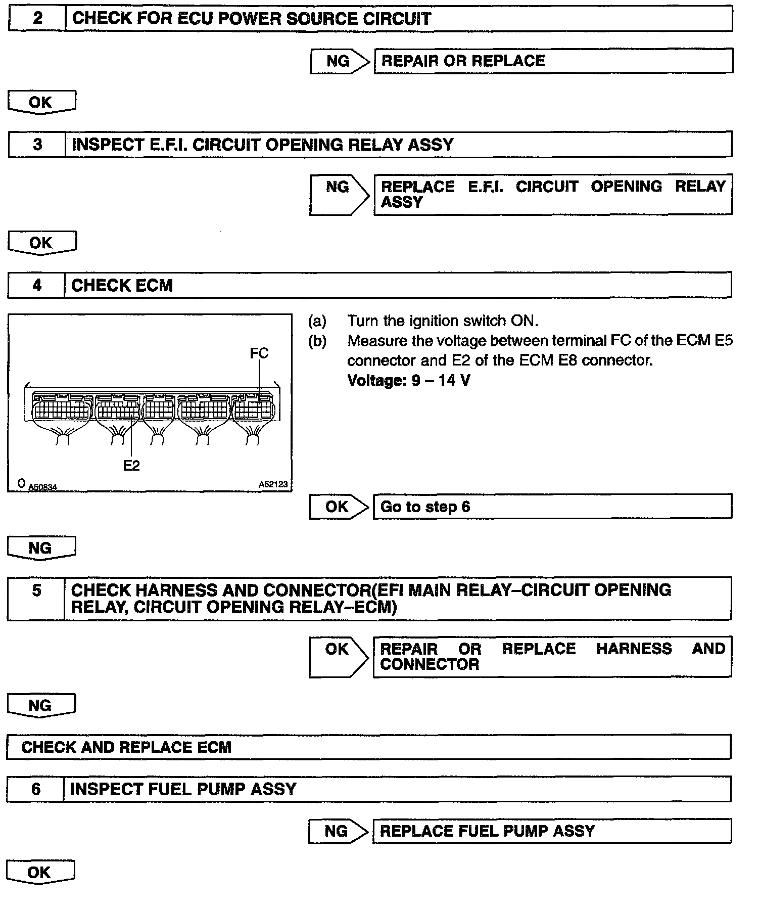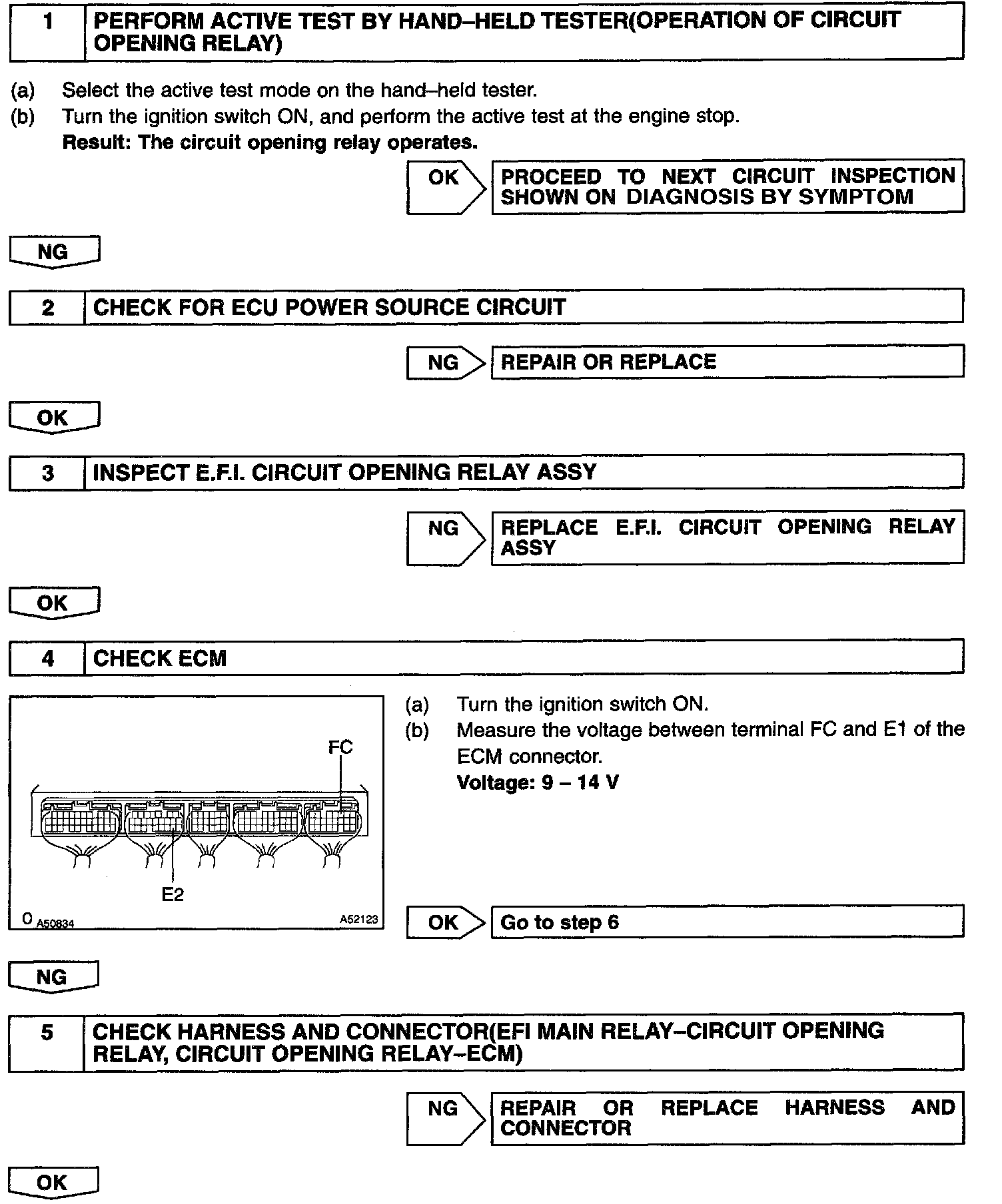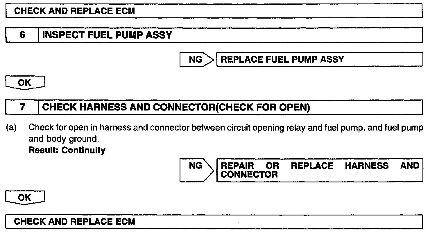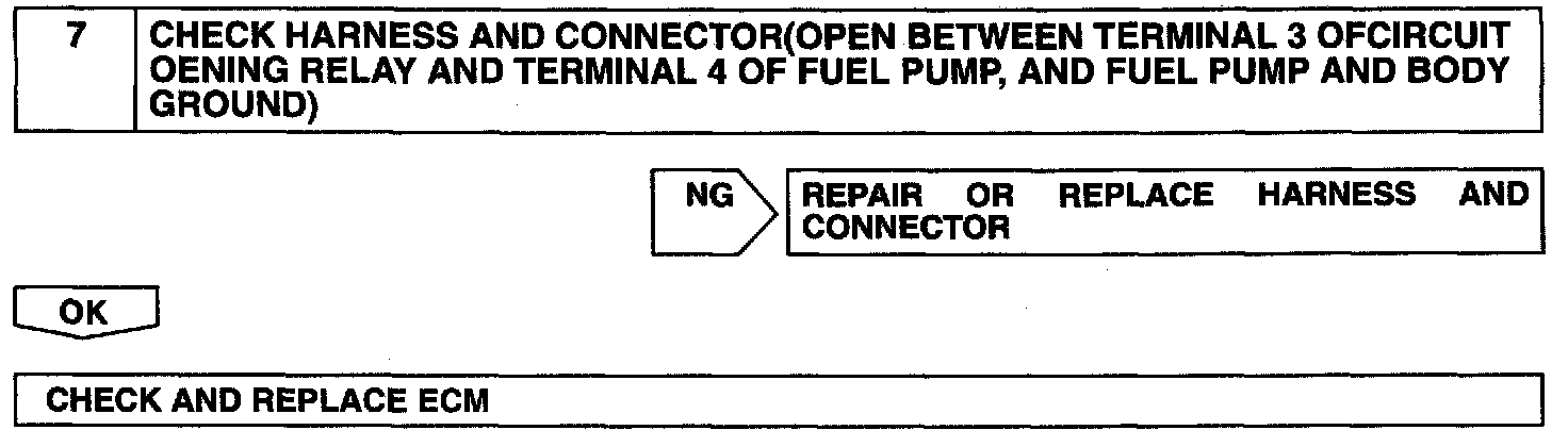 When the STA signal and NE signal are input to the ECM, Tr is turned ON, current flows to the coil of the circuit opening relay, the relay switches on, power is supplied to the fuel pump and the fuel pump operates. While the NE signal is generated (engine running), the ECM keeps Tr ON (circuit opening relay ON) and the fuel pump also keeps operating.