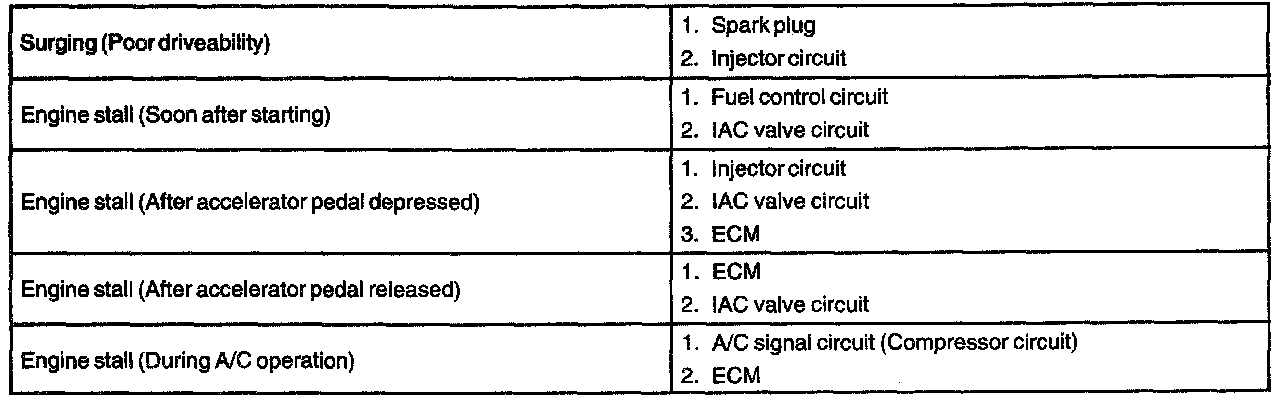 When the malfunction is not confirmed in the DTC check and the problem still can not be confirmed in the basic inspection either, proceed to this problem symptoms table and troubleshoot according to the number given.