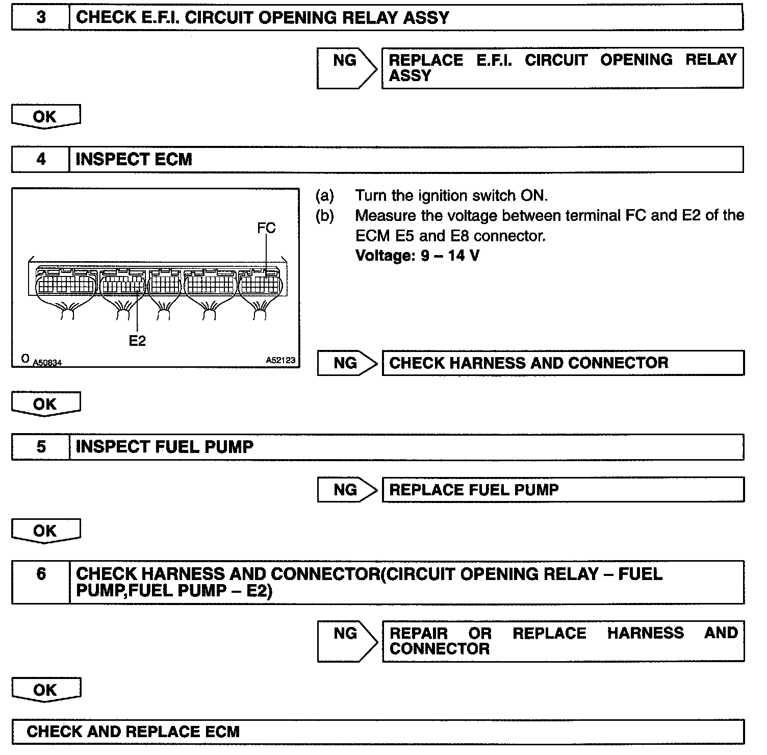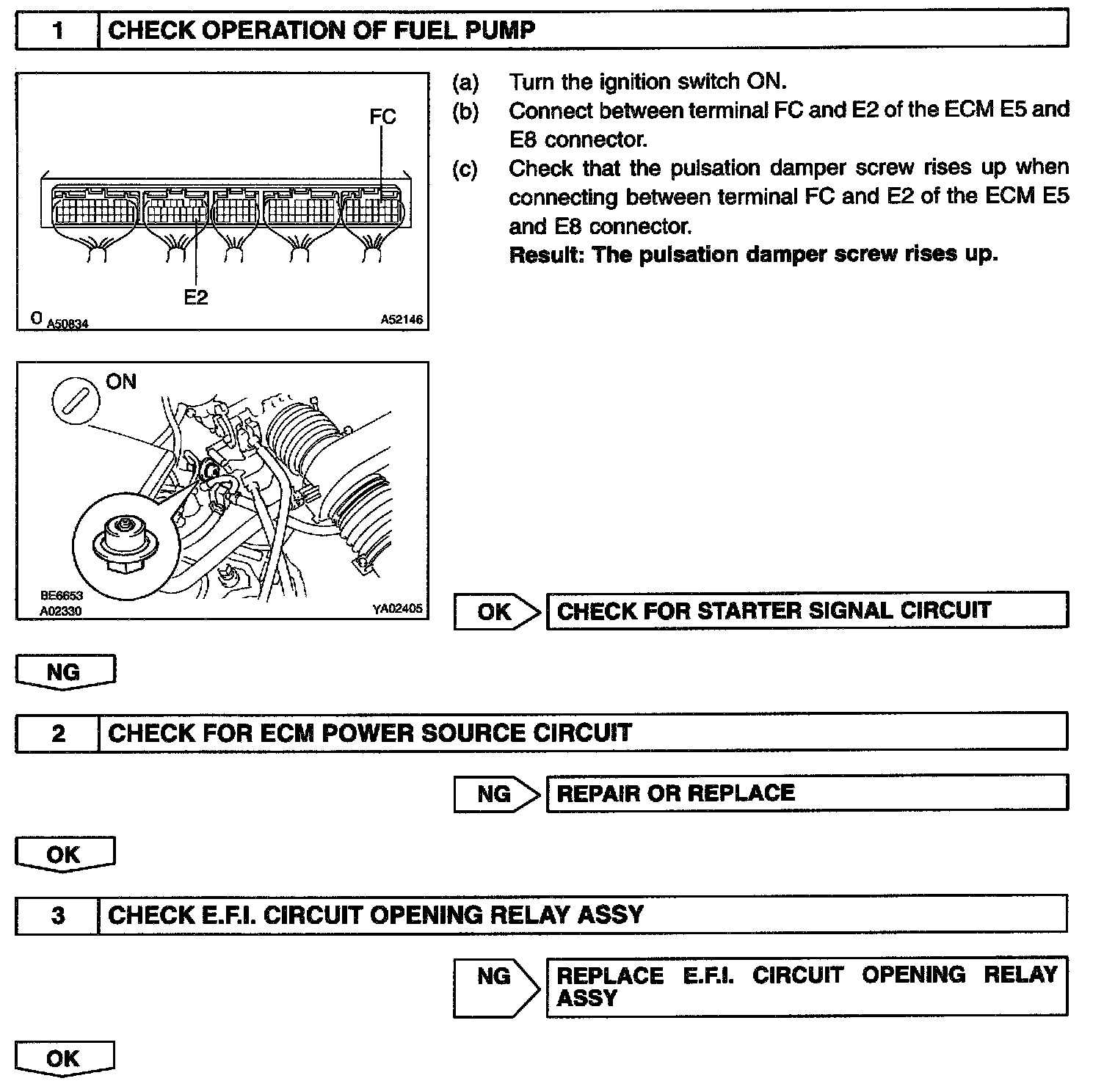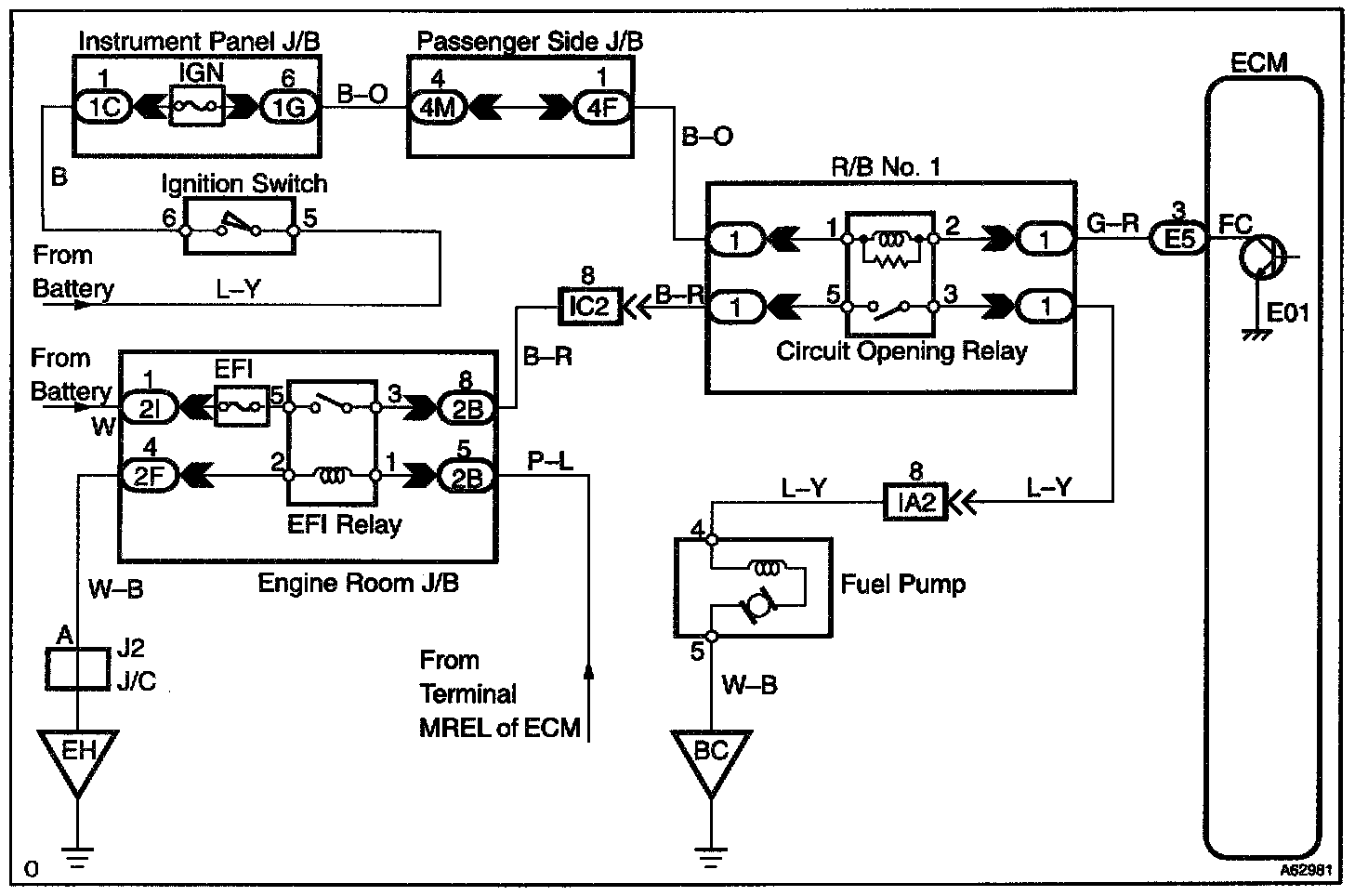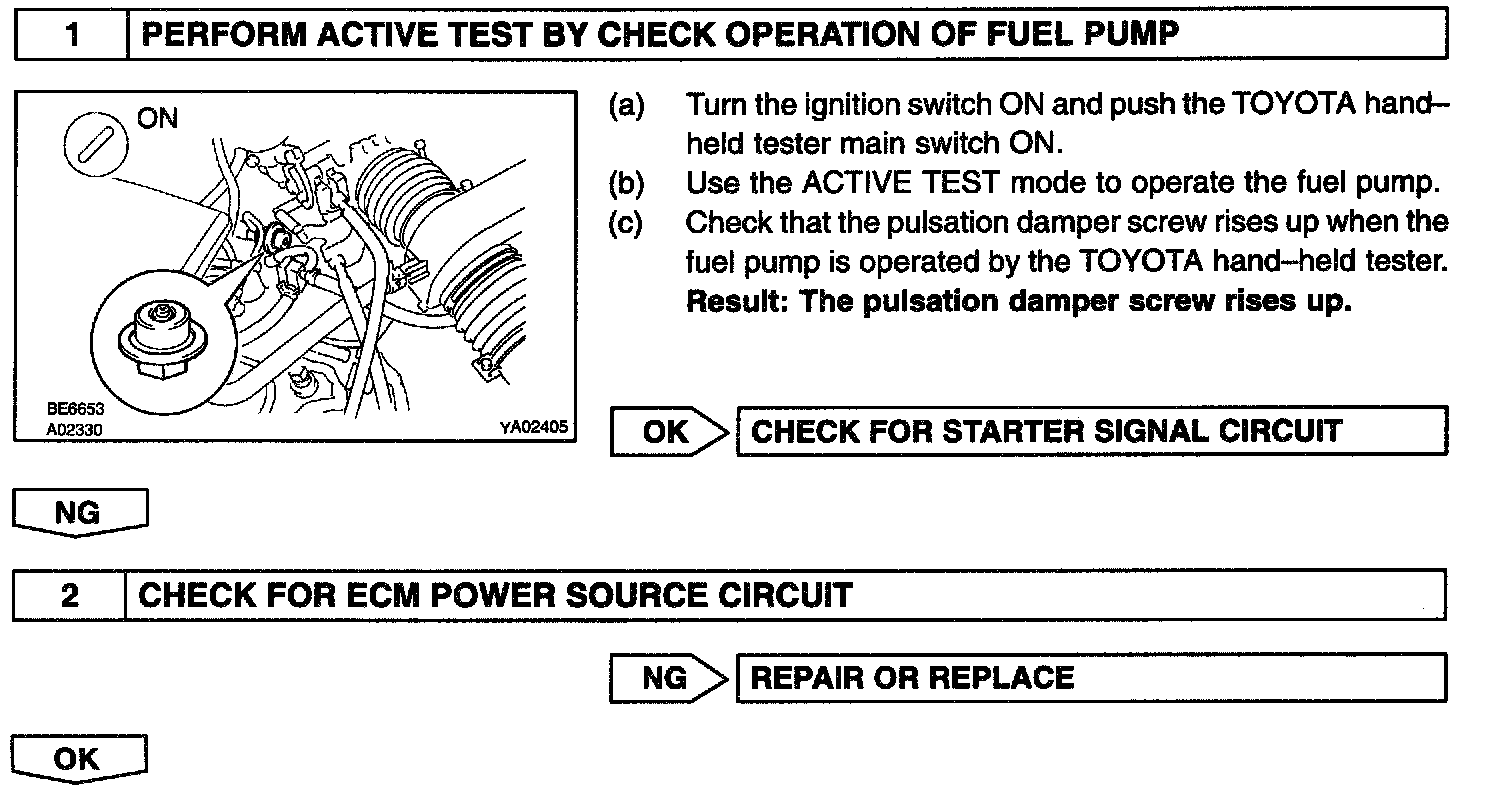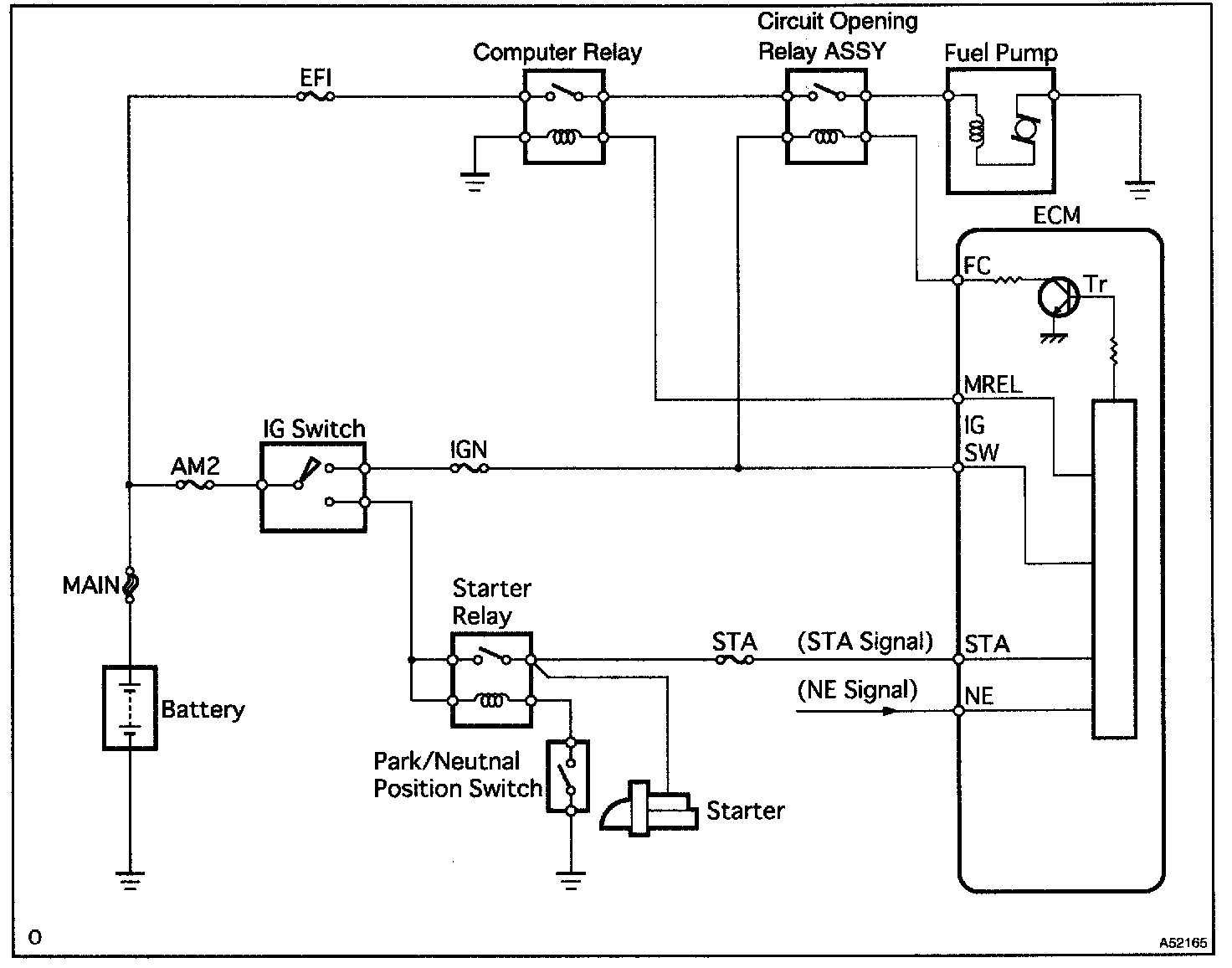 CIRCUIT DESCRIPTIONIn the diagram, when the engine is cranked, current flows from terminal ST of the ignition switch to the starter relay (Marking: ST) coil and also current flows to terminal STA of ECM (STA signal). When the STA signal and NE signal are input to the ECM, Tr is turned ON, current flows to coil of the circuit opening relay (Marking: C/OPN), the relay switches on, power is supplied to the fuel pump and the fuel pump operates.