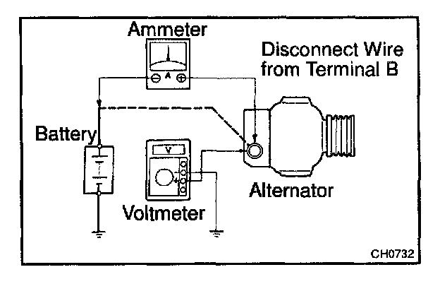 1. With the engine running from idling to 2,000 rpm, check the reading on the ammeter and voltmeter.