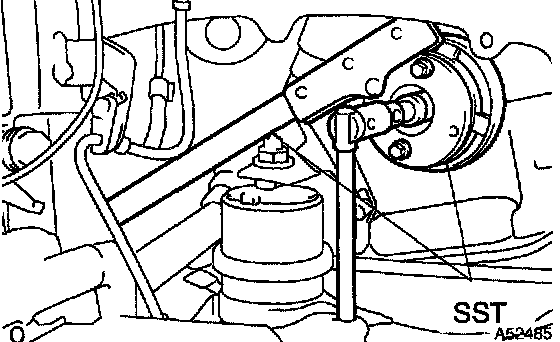 b. Put a bar ([diameter] 4 mm) in the adjusting hole of the oil pump drive shaft gear to lock in position, and remove a nut.