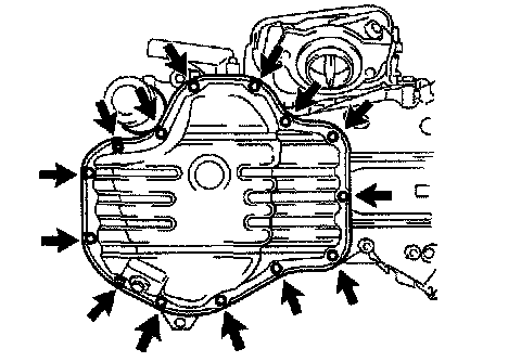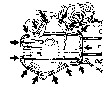 c. Install the oil pan with the 12 bolts and 2 nuts.