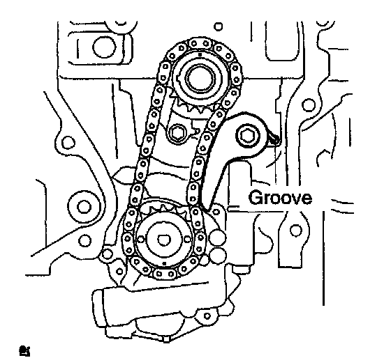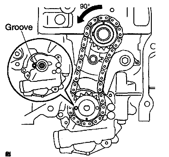 a. Turn the crankshaft counterclockwise 90°, and align an adjusting hole of the oil pump drive shaft gear with the groove of the oil pump.