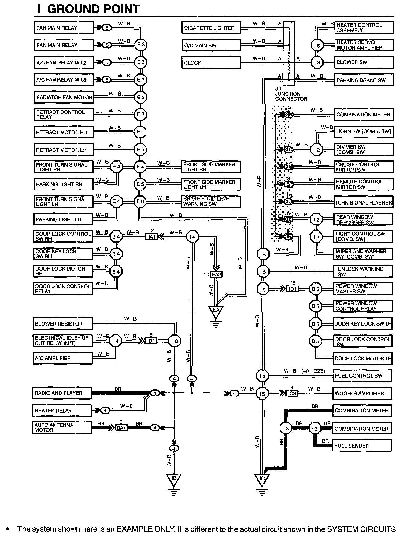 HOW TO READ GROUND POINTSThe ground points circuit diagram shows the connections from all major parts to the respective ground points. When troubleshooting a faulty ground point, checking the system circuits which use a common ground may help you identify the problem ground quickly. The relationship between ground points ([EA], [IB], [IC] and shown below) can also be checked this way.