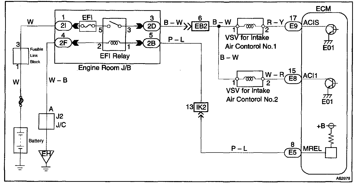 CIRCUIT DESCRIPTIONThis circuit opens and closes the IACV (Intake Air Control Valve) in response to the engine load in order to increase the intake efficiency (ACIS: Acoustic Control Induction System).