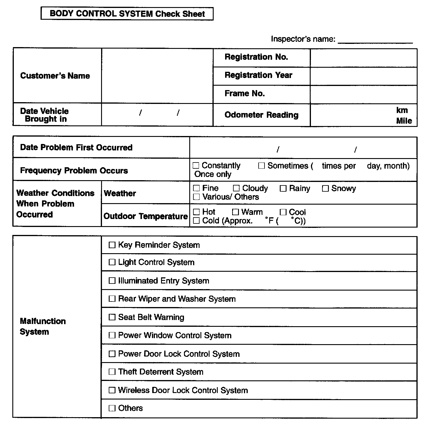 Body Control System Check Sheet: