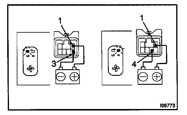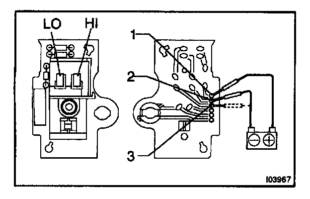1. Connect the positive (+) lead from the battery to terminal 1 and negative (-) lead to each terminal, then check that the "LO" and "HI" indicators light up as shown in the chart.