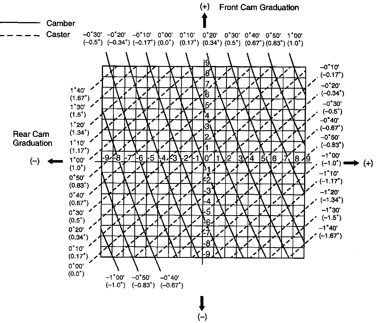 3. As shown in the chart, read the distances from the marked point to 0 point, and adjust the front and/or rear adjusting cams accordingly.