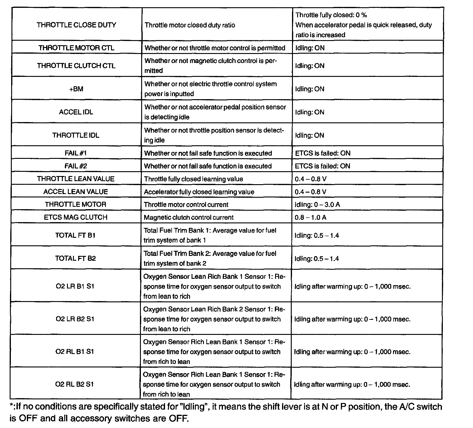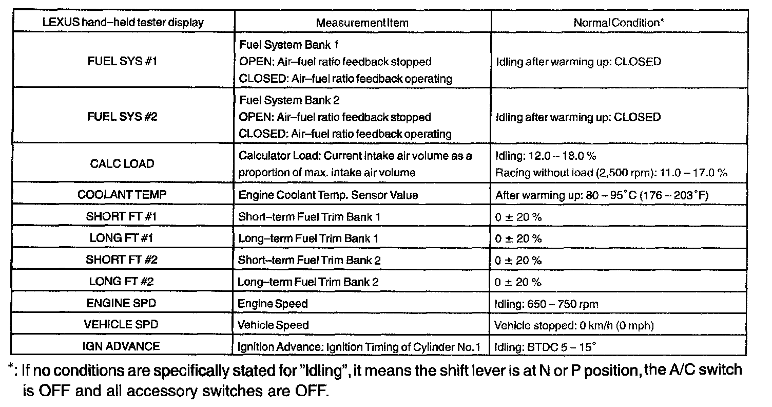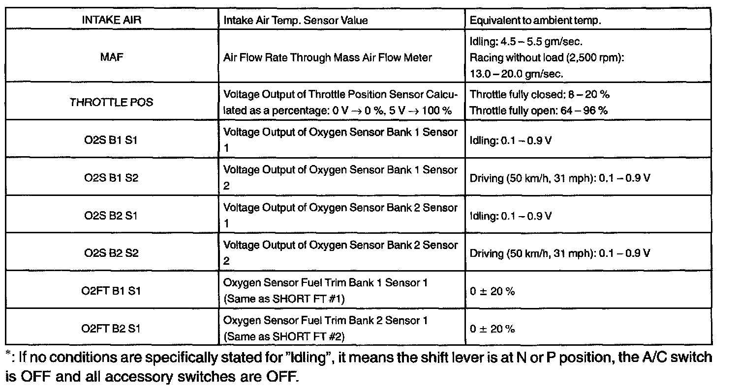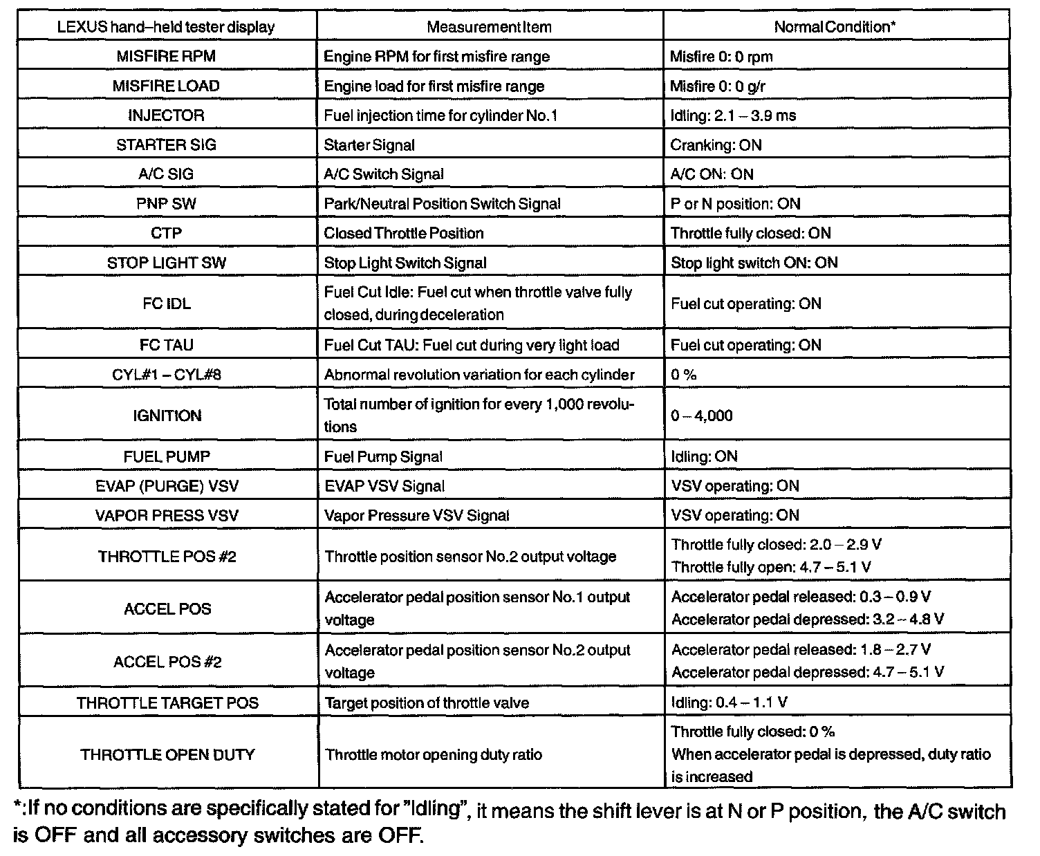 NOTE: The values given for "Normal Condition" are representative values, so a vehicle may still be normal even if its value varies differ from those listed here. So do not decide whether a part is faulty or not solely according to the "Normal Condition" here.