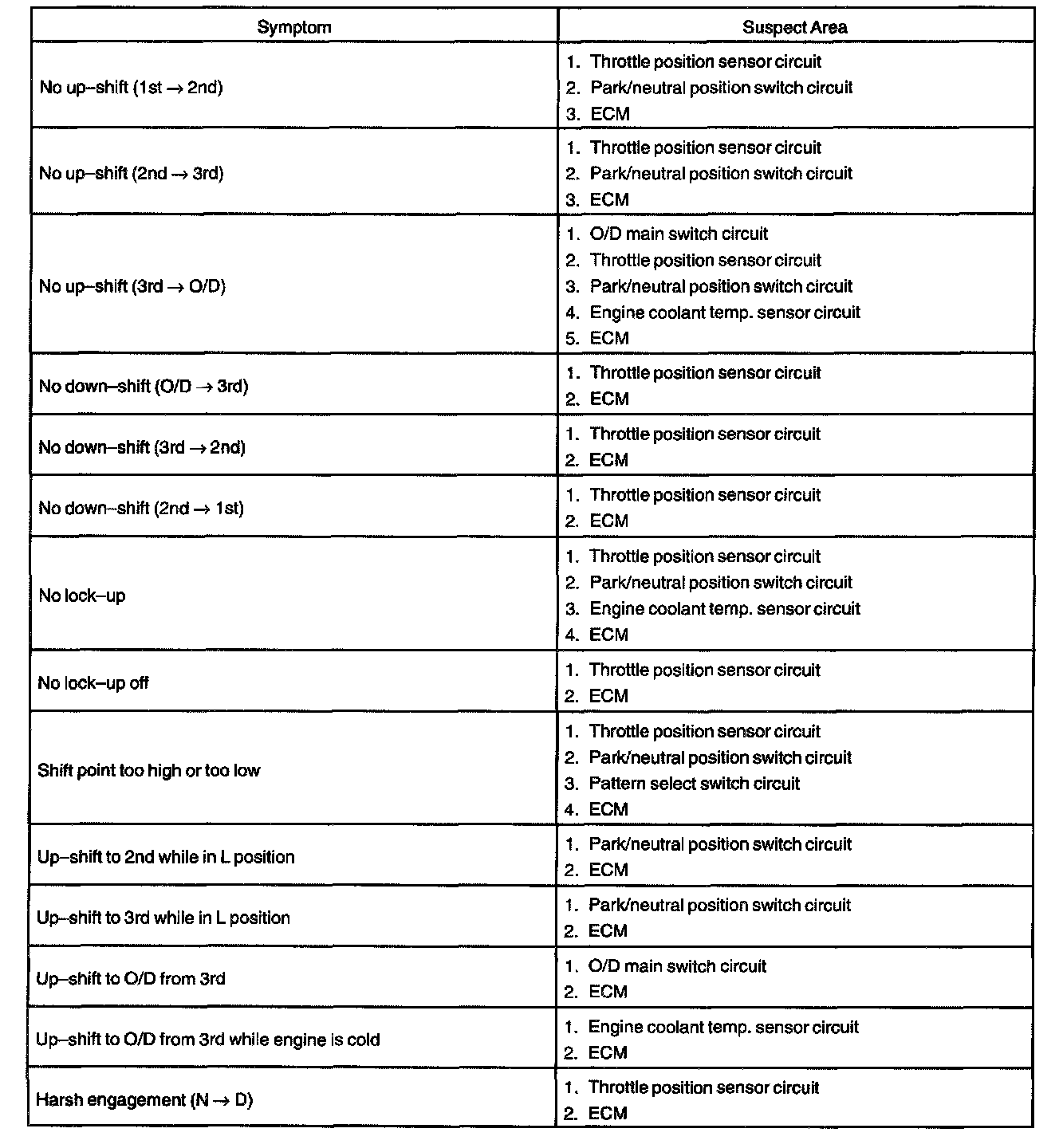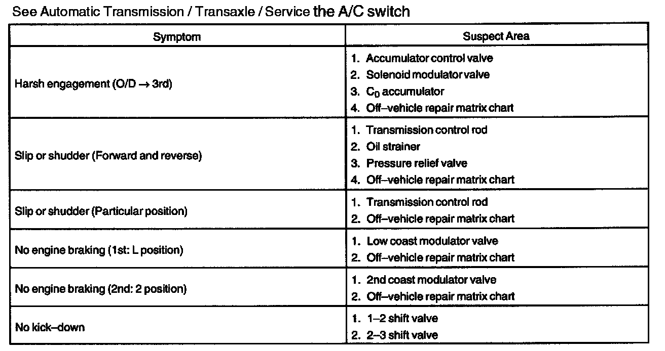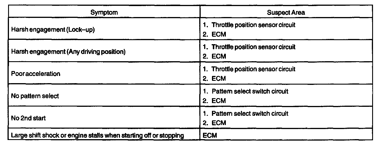 PROBLEM SYMPTOMS TABLEIf a normal code is displayed during the diagnostic trouble code check but the trouble still occurs, check the circuits for each symptom in the order given in the charts and proceed to the given troubleshooting.