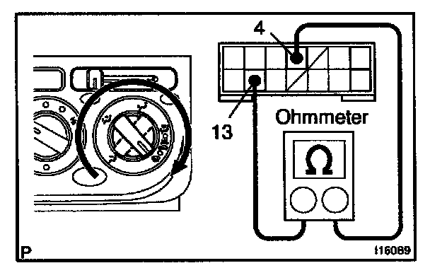 Using an ohmmeter, apply the tester as shown in the illustration to the test for continuity.