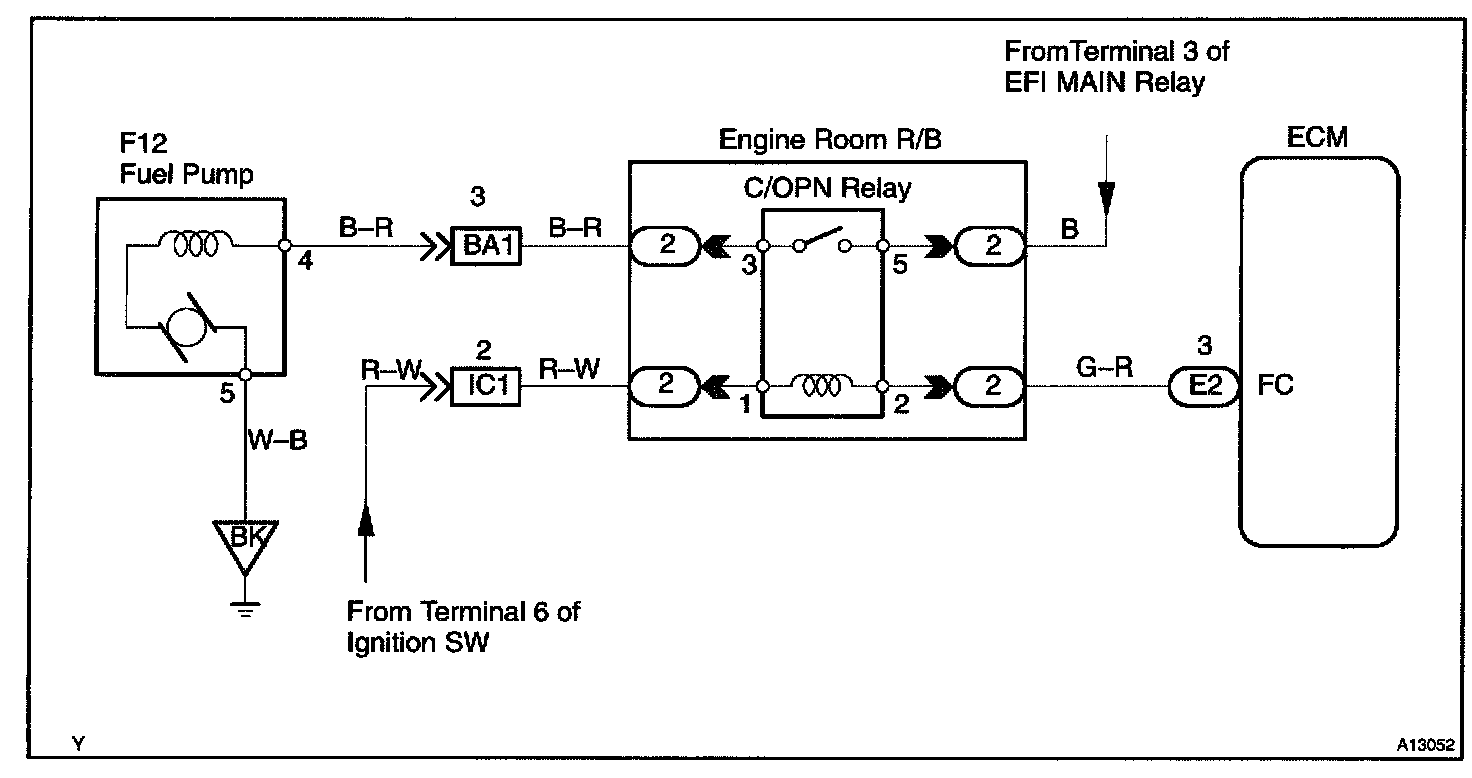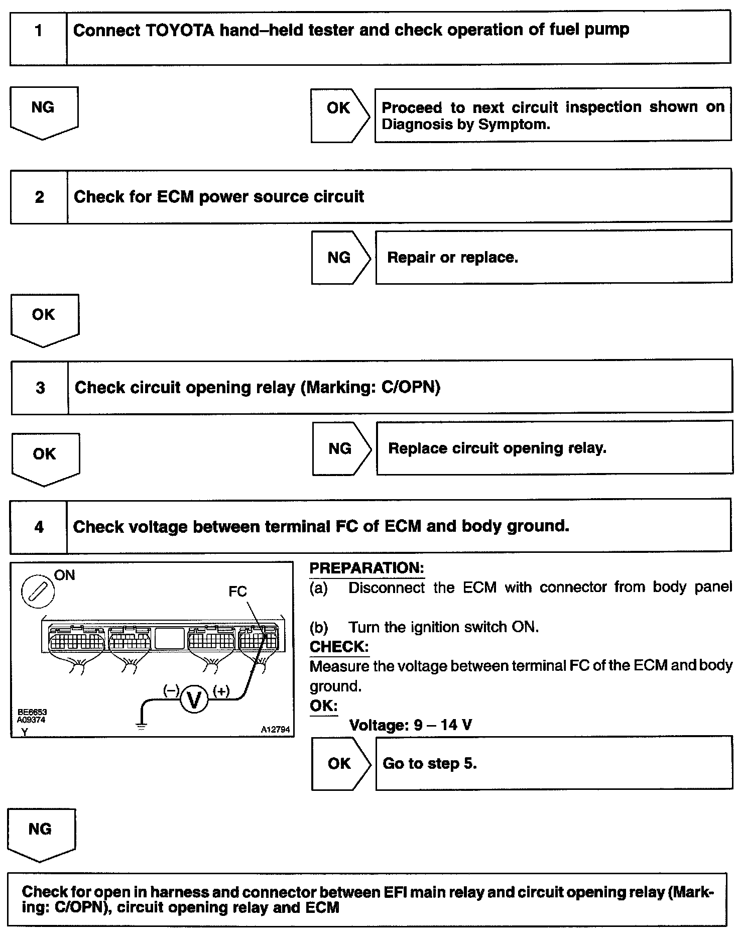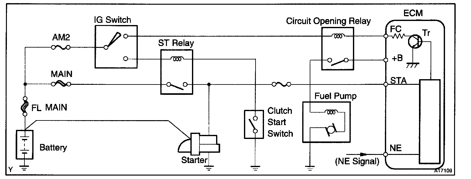 When the STA signal and NE signal are input to the ECM, Tr is turned ON, current flows to coil of the circuit opening relay, the relay switches on, power is supplied to the fuel pump and the fuel pump operates. While the NE signal is generated (engine running), the ECM keeps Tr ON (circuit opening relay ON) and the fuel pump also keeps operating.
