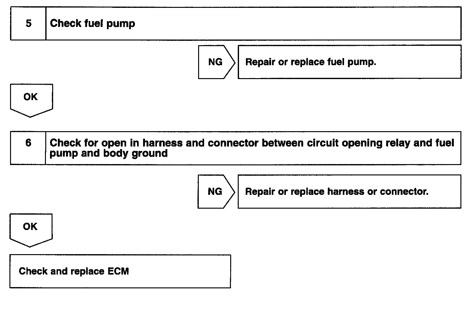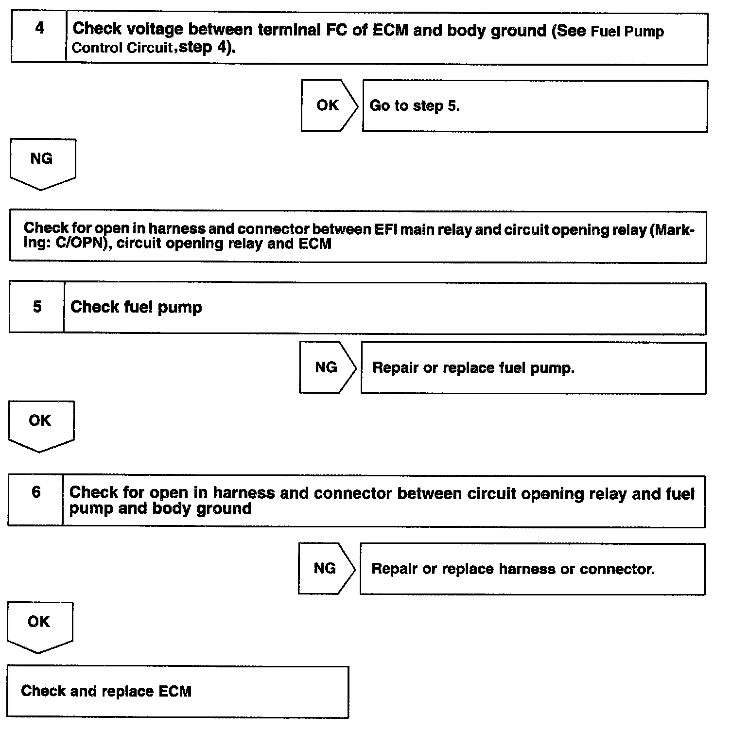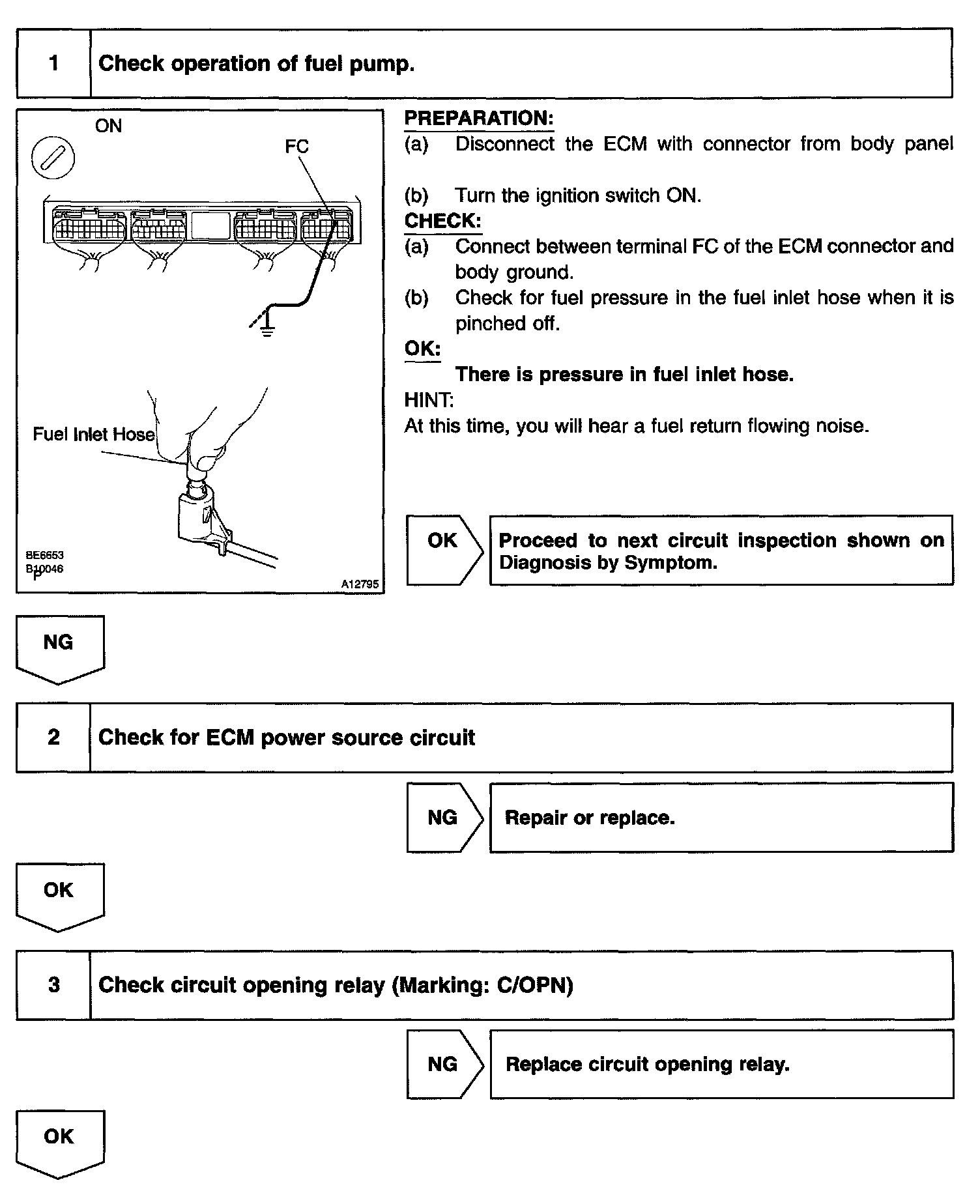 When the STA signal and NE signal are input to the ECM, Tr is turned ON, current flows to coil of the circuit opening relay, the relay switches on, power is supplied to the fuel pump and the fuel pump operates. While the NE signal is generated (engine running), the ECM keeps Tr ON (circuit opening relay ON) and the fuel pump also keeps operating.