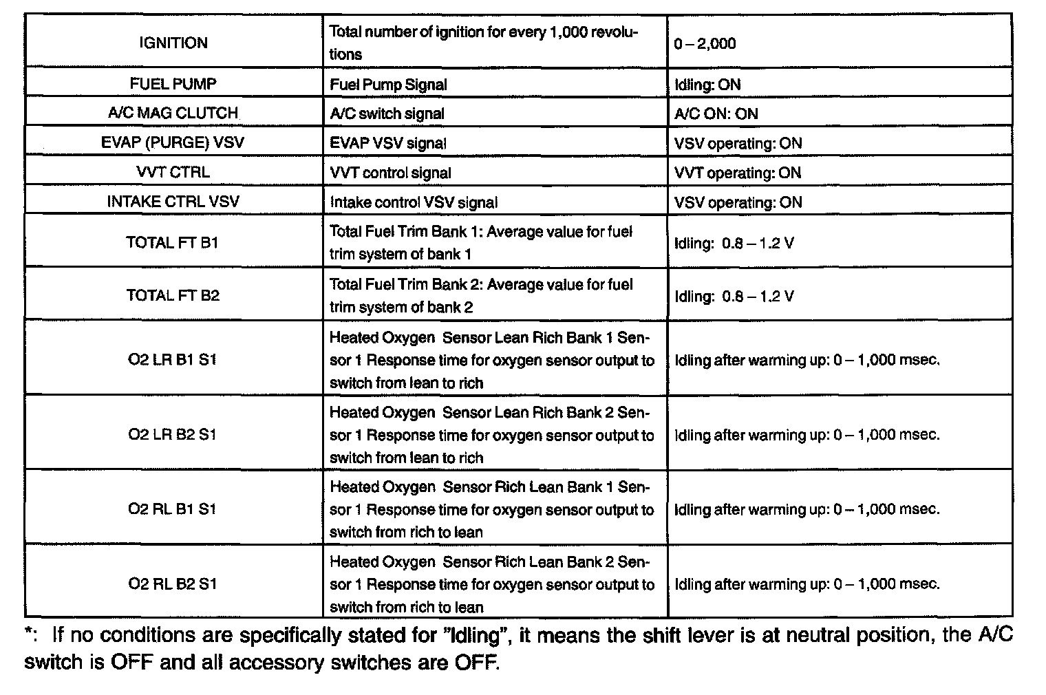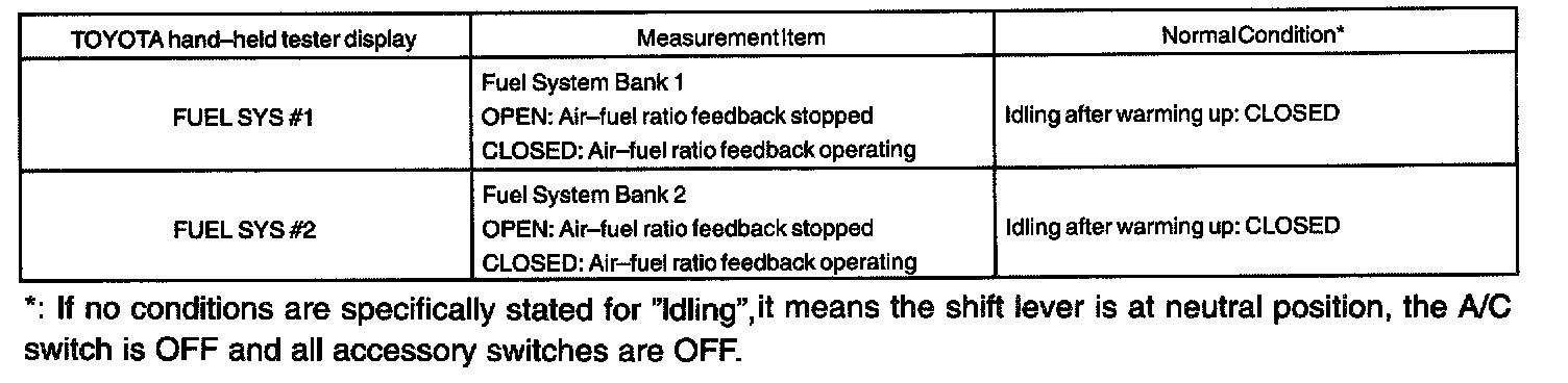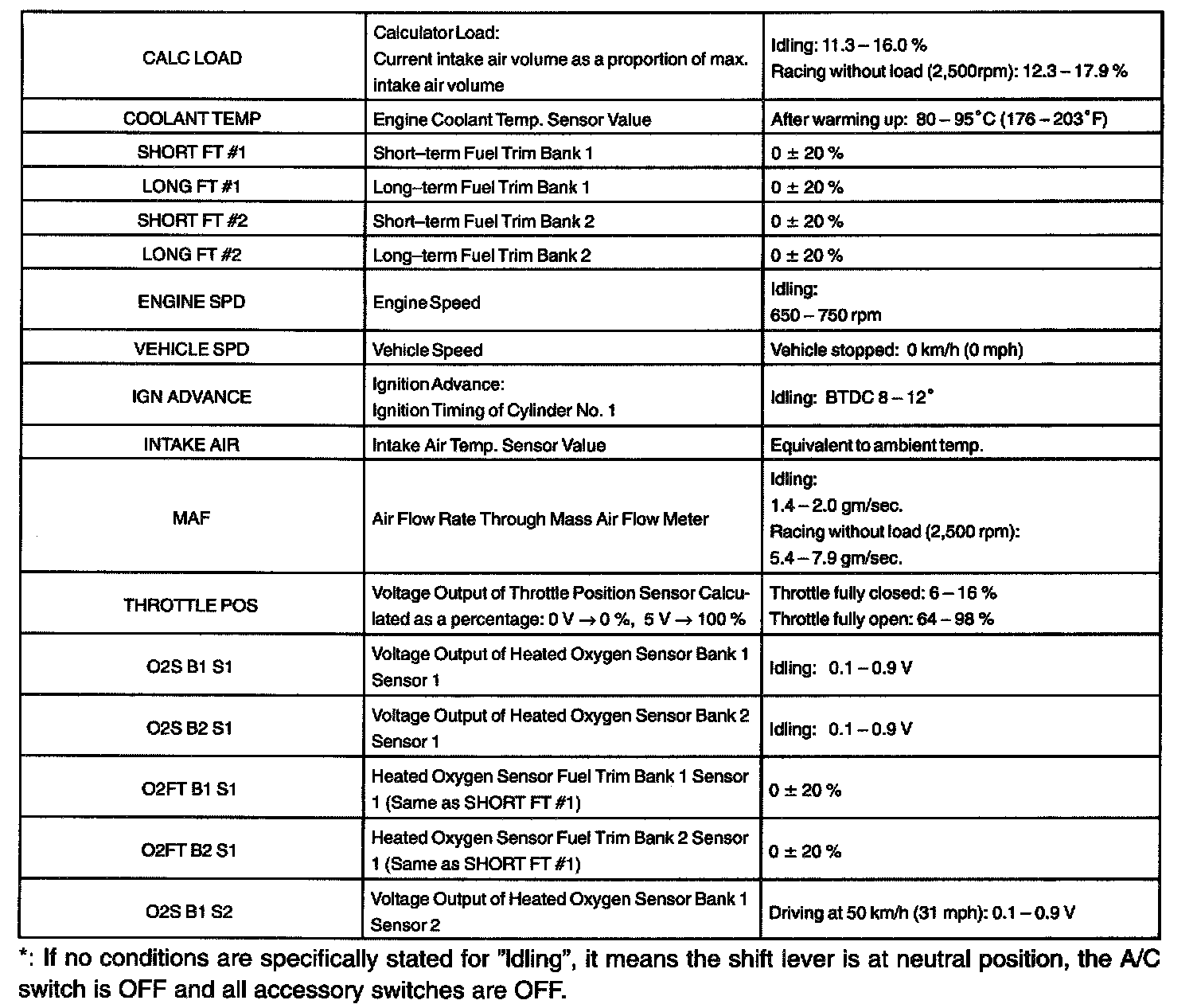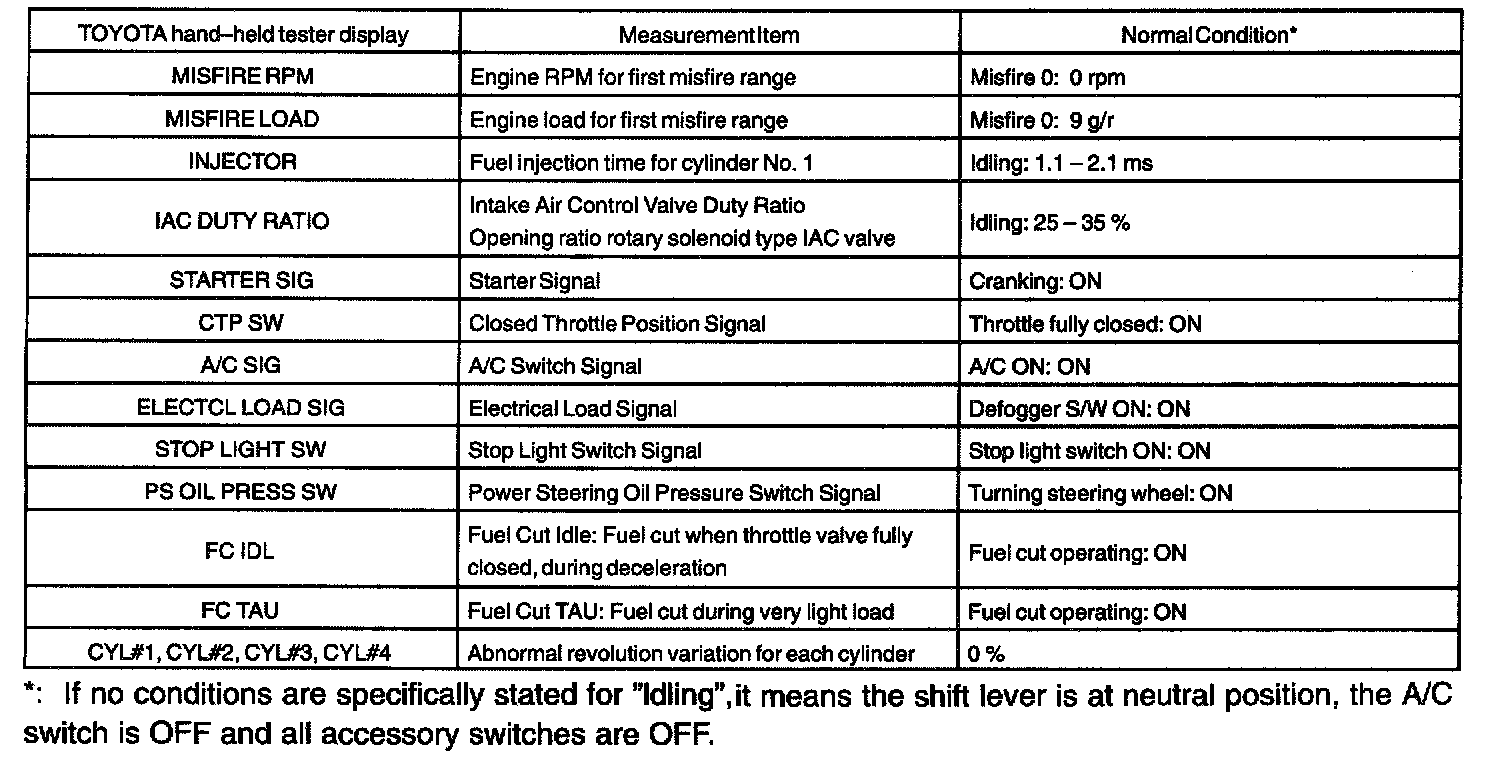 NOTE: The values given for "Normal Condition" are representative values, so a vehicle may still be normal even if its value varies from those listed here. So do not decide whether a part is faulty or not solely according to the "Normal Condition" here.