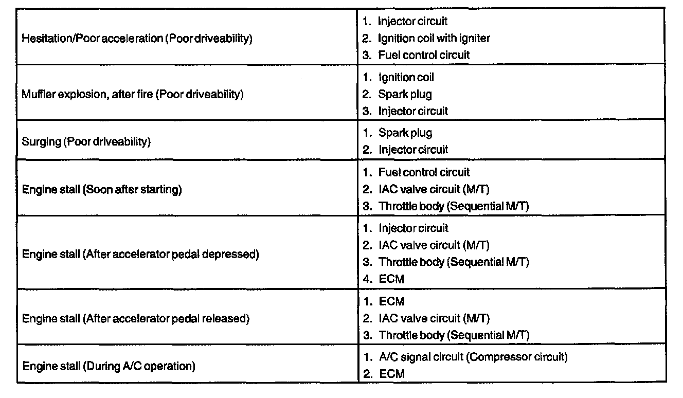 When the malfunction is not confirmed in the diagnostic trouble code check and the problem still can not be confirmed in the basic inspection, proceed to this table and troubleshoot according to the numbered order given.