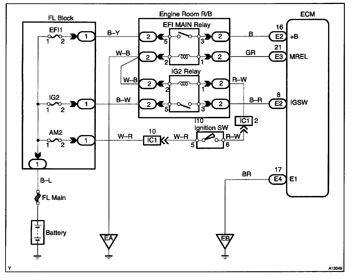 CIRCUIT DESCRIPTIONWhen the ignition switch is turned on, battery positive voltage is applied to IG2 Relay, terminal IGSW of the ECM and the EFI main relay (Marking: EFI MAIN) control circuit in the ECM sends a signal to terminal MREL of the ECM switching on the EFI main relay.