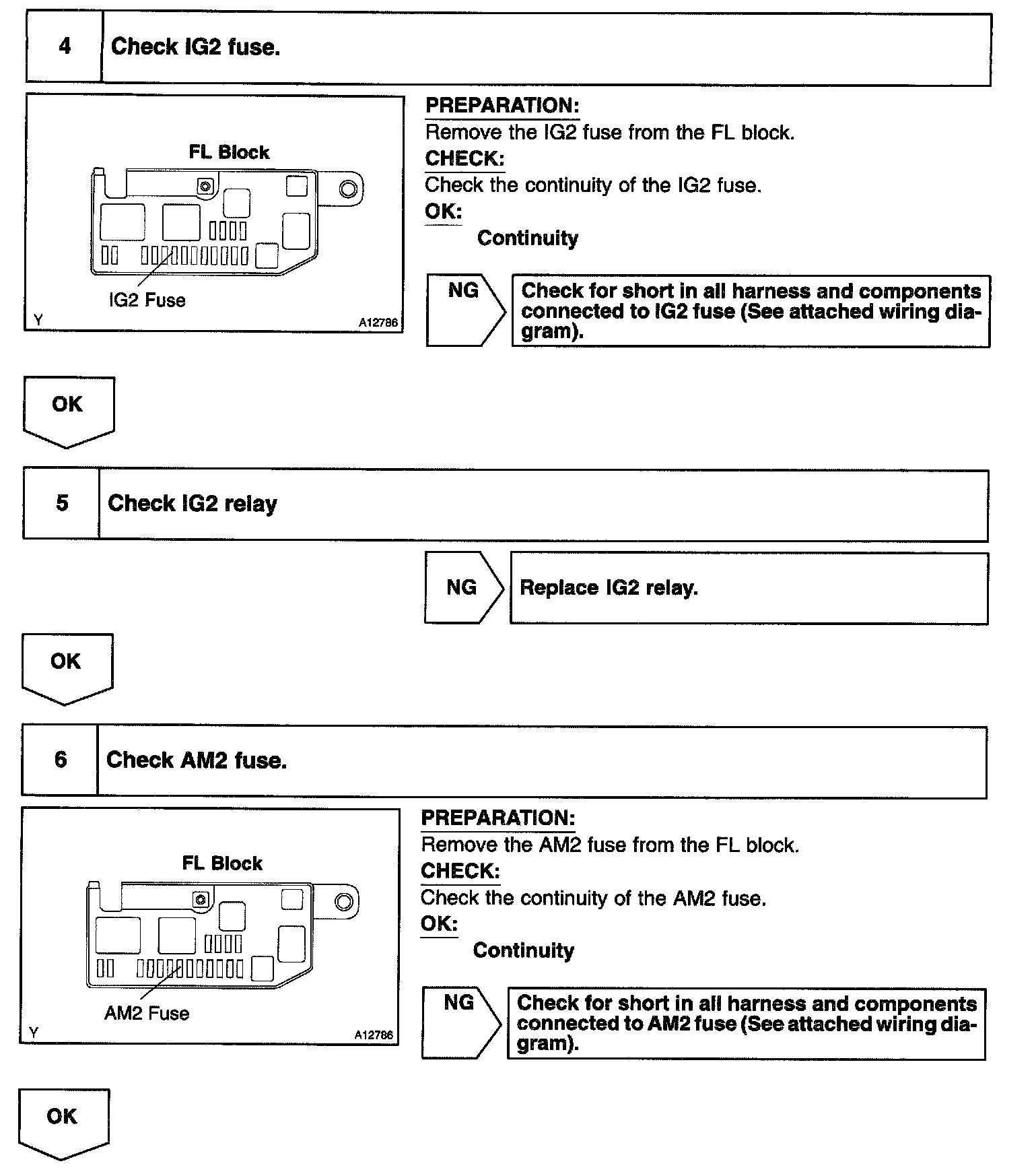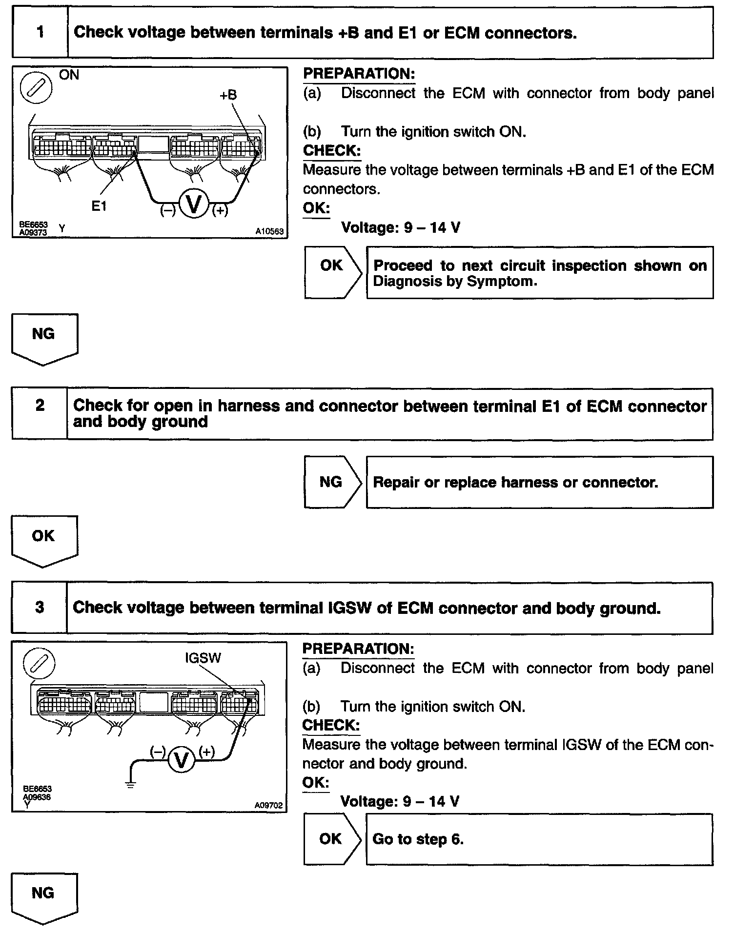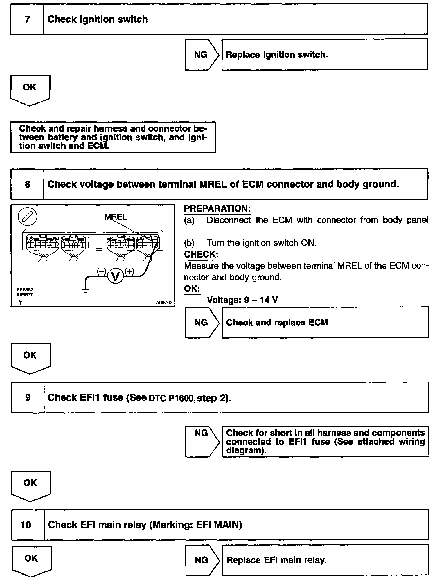 This signal causes current to flow to the coil, closing the contacts of the EFI main relay and supplying power to terminals +B of the ECM.