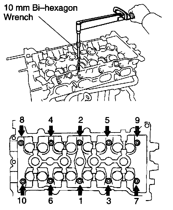 b. Using a 10 mm bi-hexagon wrench, install and uniformly tighten the 10 cylinder head bolts and plate washers in several passes, in the sequence shown.
