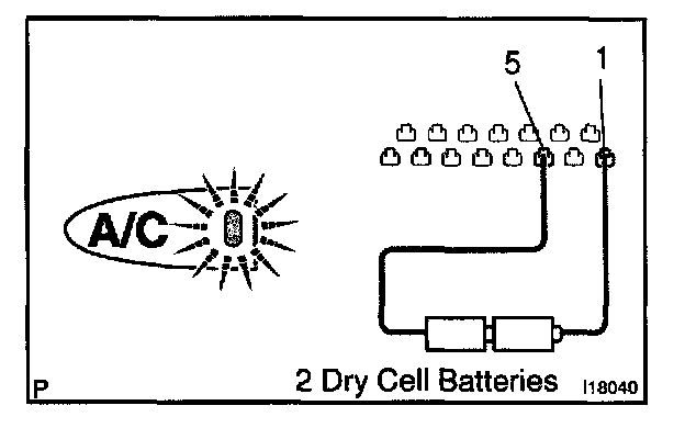 Connect the positive (+) lead from the two 1.5 V dry cell batteries to terminals 1 and negative (-) lead to terminal 5, then check that the A/C indicator lights up.