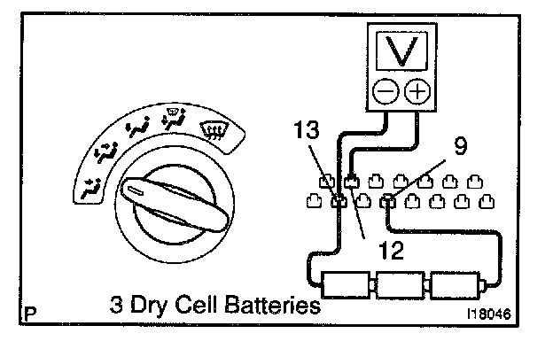 c. Connect the positive (+) lead from the tester to terminal 12 and negative (-) lead to terminal 13, then check that the voltage at each dial position, as shown in the chart.