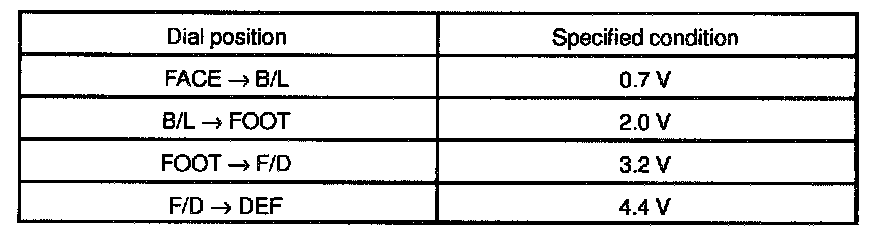 c. Connect the positive (+) lead from the tester to terminal 10 and negative (-) lead to terminal 13 then check that the voltage at each dial position, as shown in the chart.