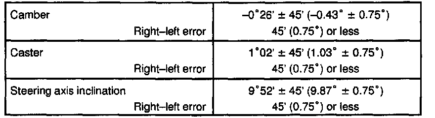 If the caster and steering axis inclination are not within the specified values, after the camber has been correctly adjusted, recheck the suspension parts for damaged and/or worn out parts.
