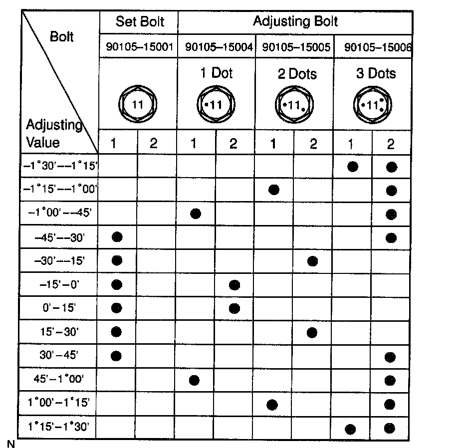 If the camber is not within the specified value, using the following table, estimate how much additional camber adjustment will be required, and select the camber adjusting bolt.