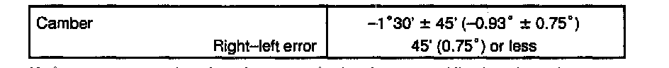 If the measured value is not within the specified value, inspect the suspension parts for damage and/or wear and replace them if necessary because camber is not adjustable.