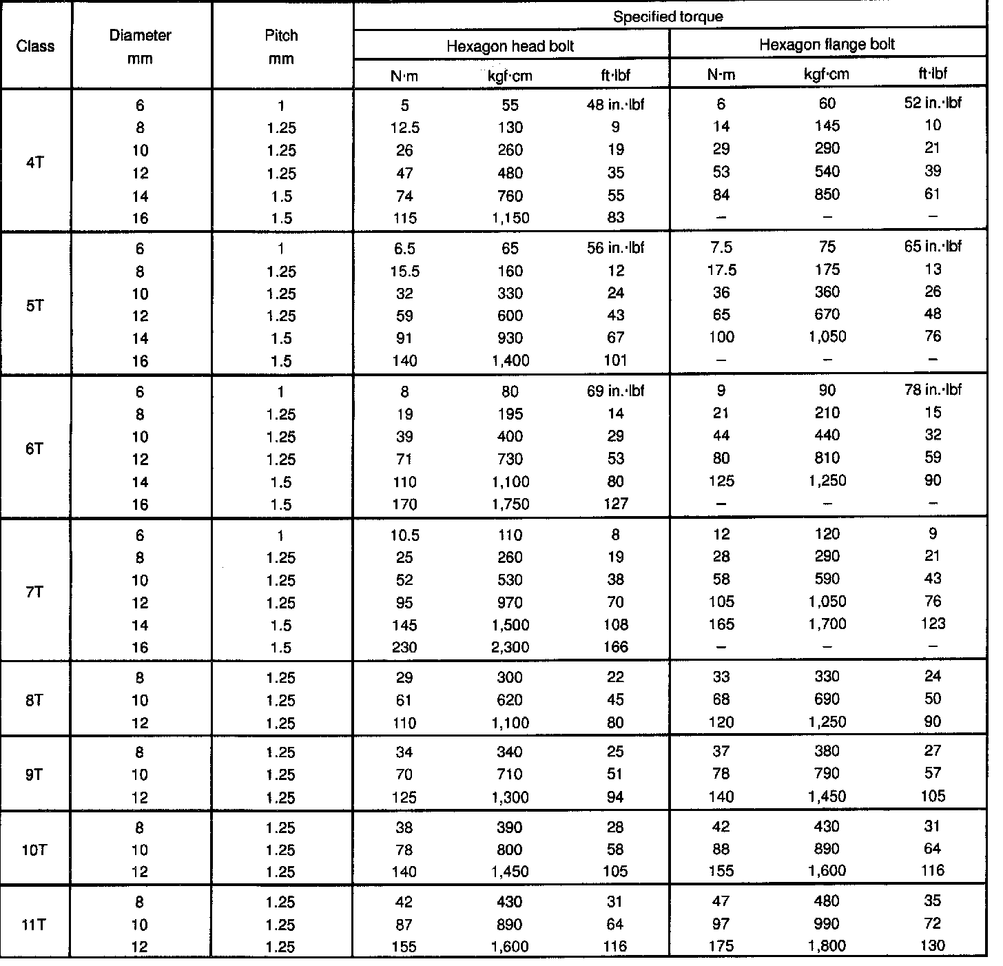 SPECIFIED TORQUE FOR STANDARD BOLTS:
