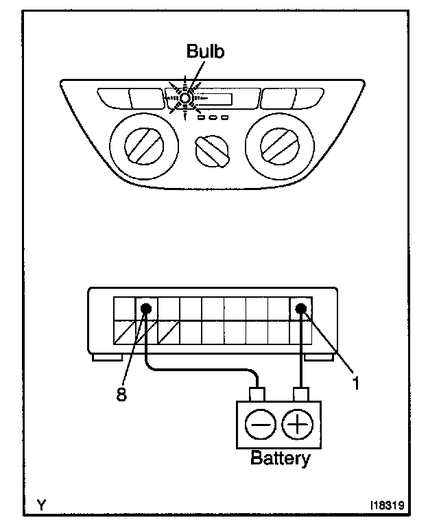 b. Connect the positive (+) lead from the battery to terminal 1 and negative (-) lead to terminal 8 then check that the passenger side seat belt illuminations lights up.